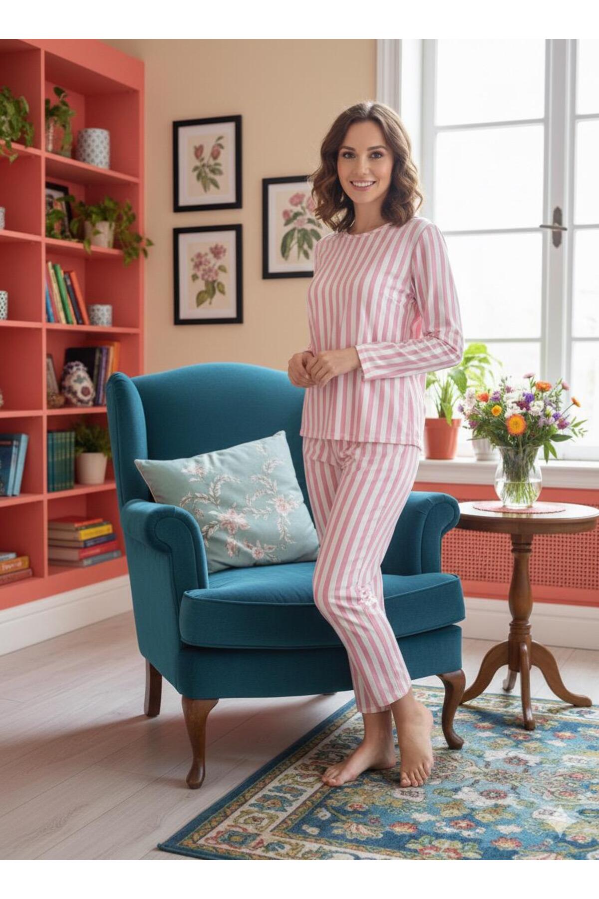 trendmodaal طقم بيجامة من قماش السويد المزخرف بنقوش مخططة