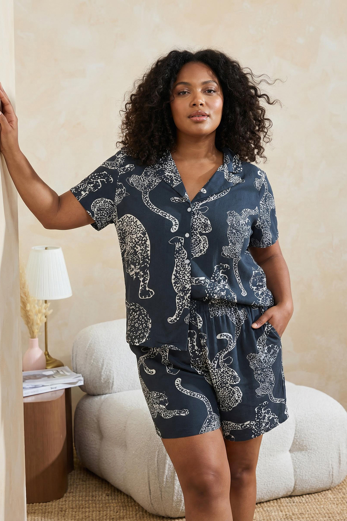 ميزات طقم بيجامة منسوجة بياقة نمط النمر من أنثراسايت TBBSS24AI00072 من Trendyol Curve