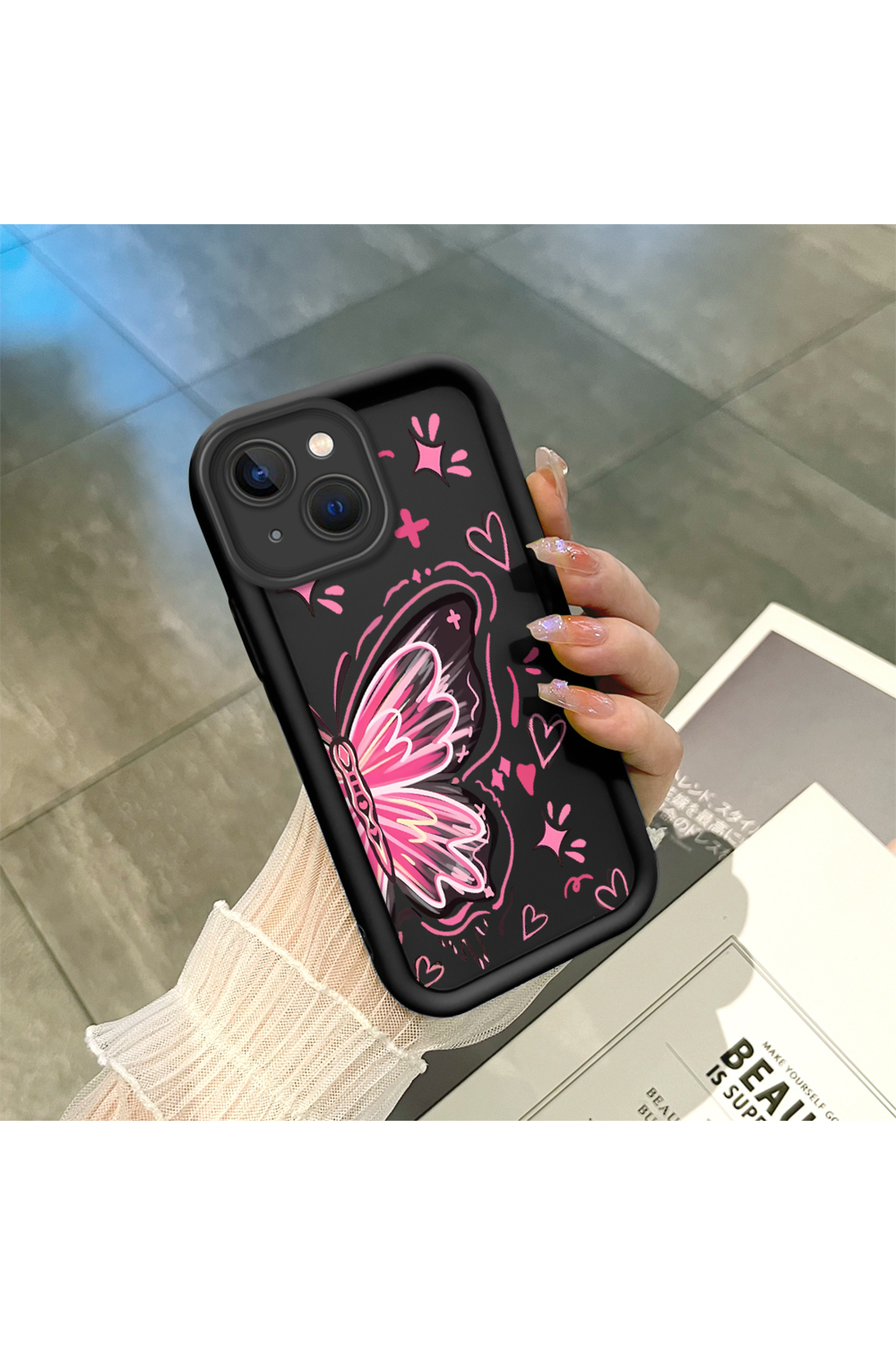 ميزات حافظة متوافقة مع هاتف iPhone 15 Plus مصنوعة من مادة السيليكون المقاومة للصدمات باللون الأسود ونمط الفراشة من ucuc