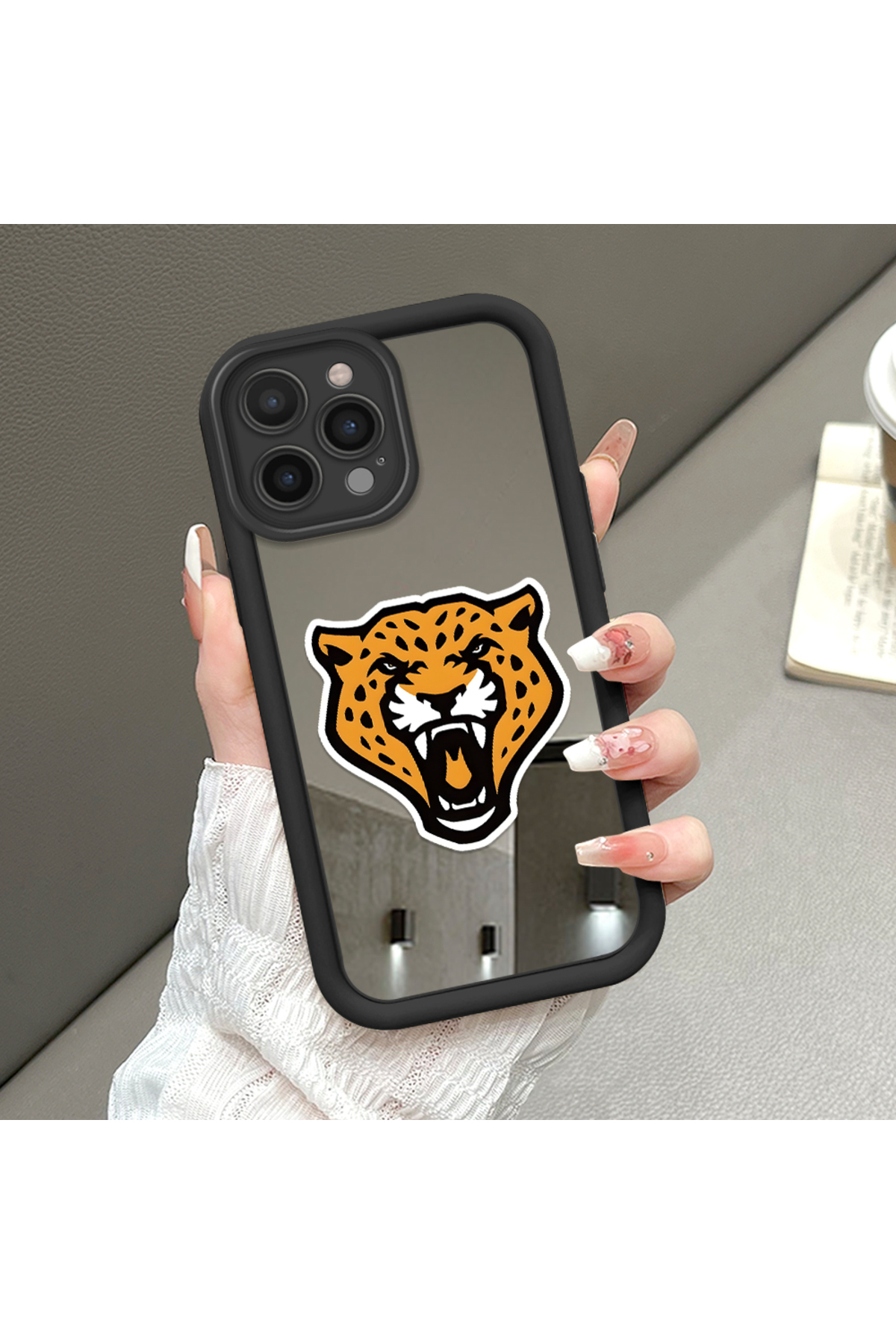 ucuc حافظة سيليكون سوداء مقاومة للسقوط متوافقة مع آيفون 16 برو ماكس مع أنماط الفهد على الوجه المرآة