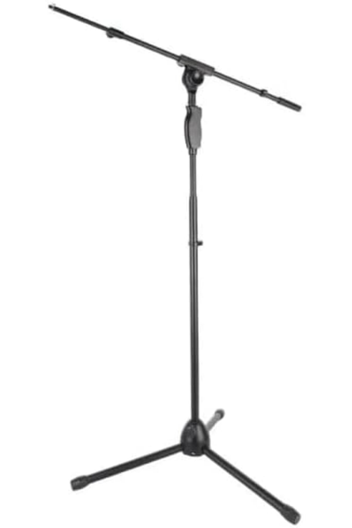 Sturdy tripod base, adjustable height and boom arm for precise positioning, foldable design for easy transport, and secure locking mechanisms to keep the microphone in place
