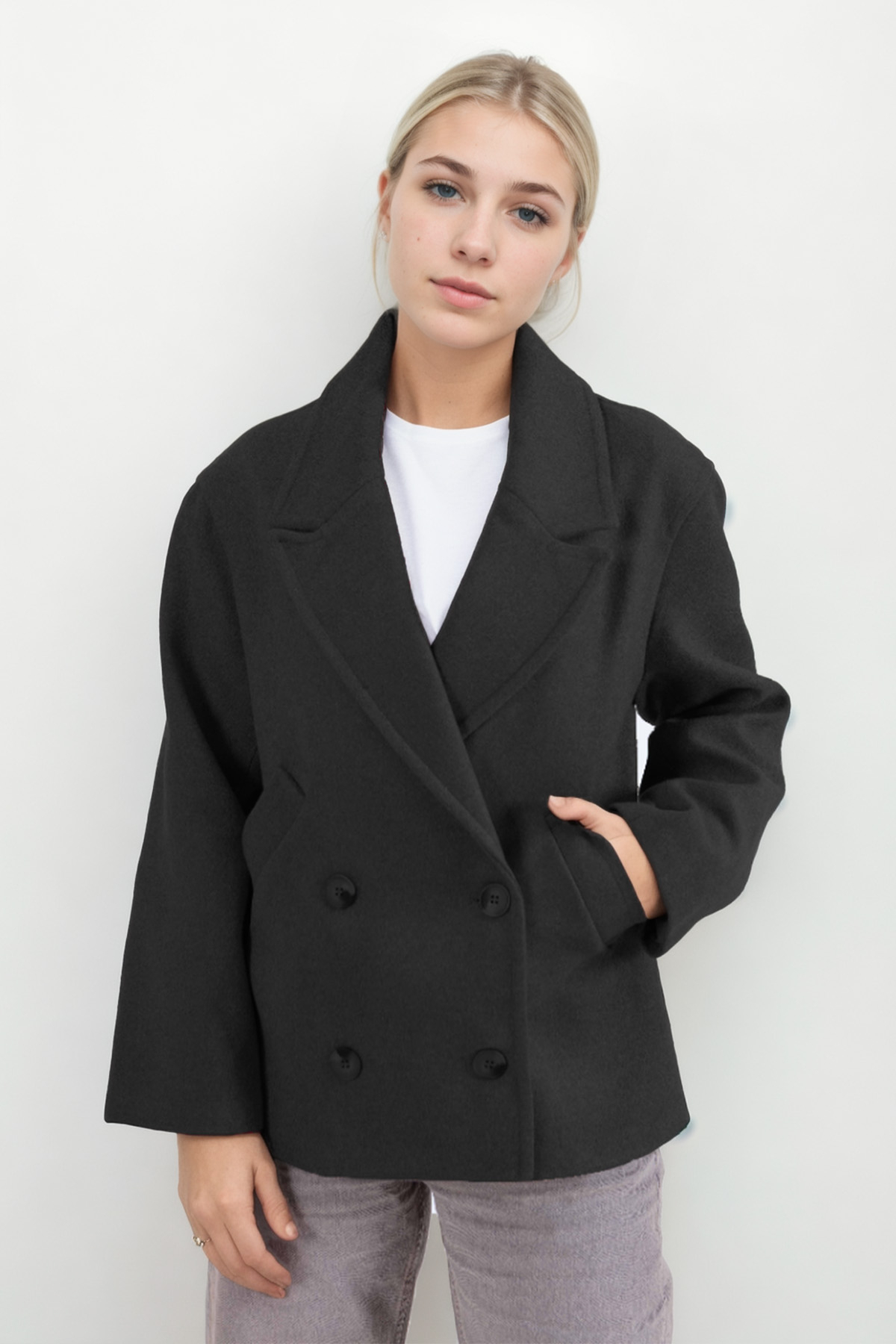 ميزات معطف قصير بأزرار من Vitrin