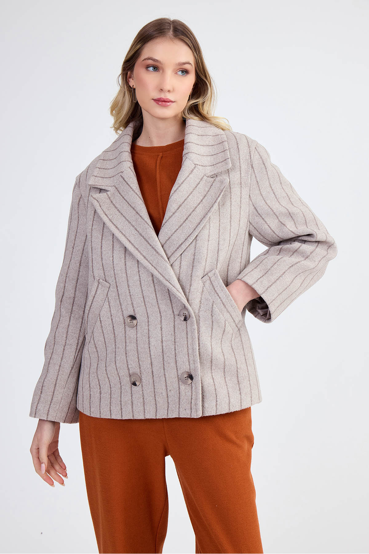 ميزات معطف مخطط خارج الكتف من Vitrin