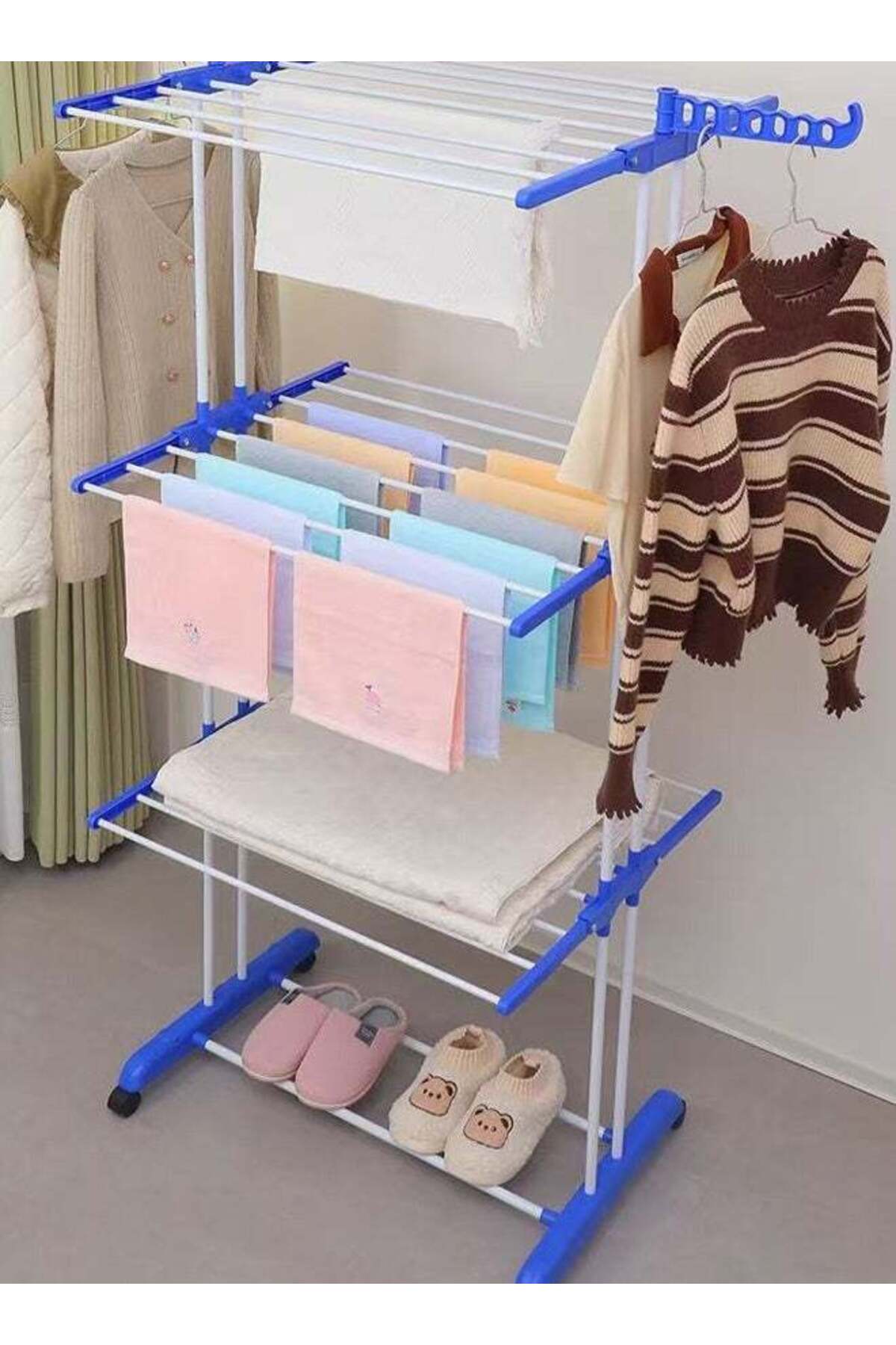 ميزات رف تجفيف الملابس ثلاثي الطبقات قابل للطي والحركة وذو عمودين مثبت على الأرض من VOGMAX