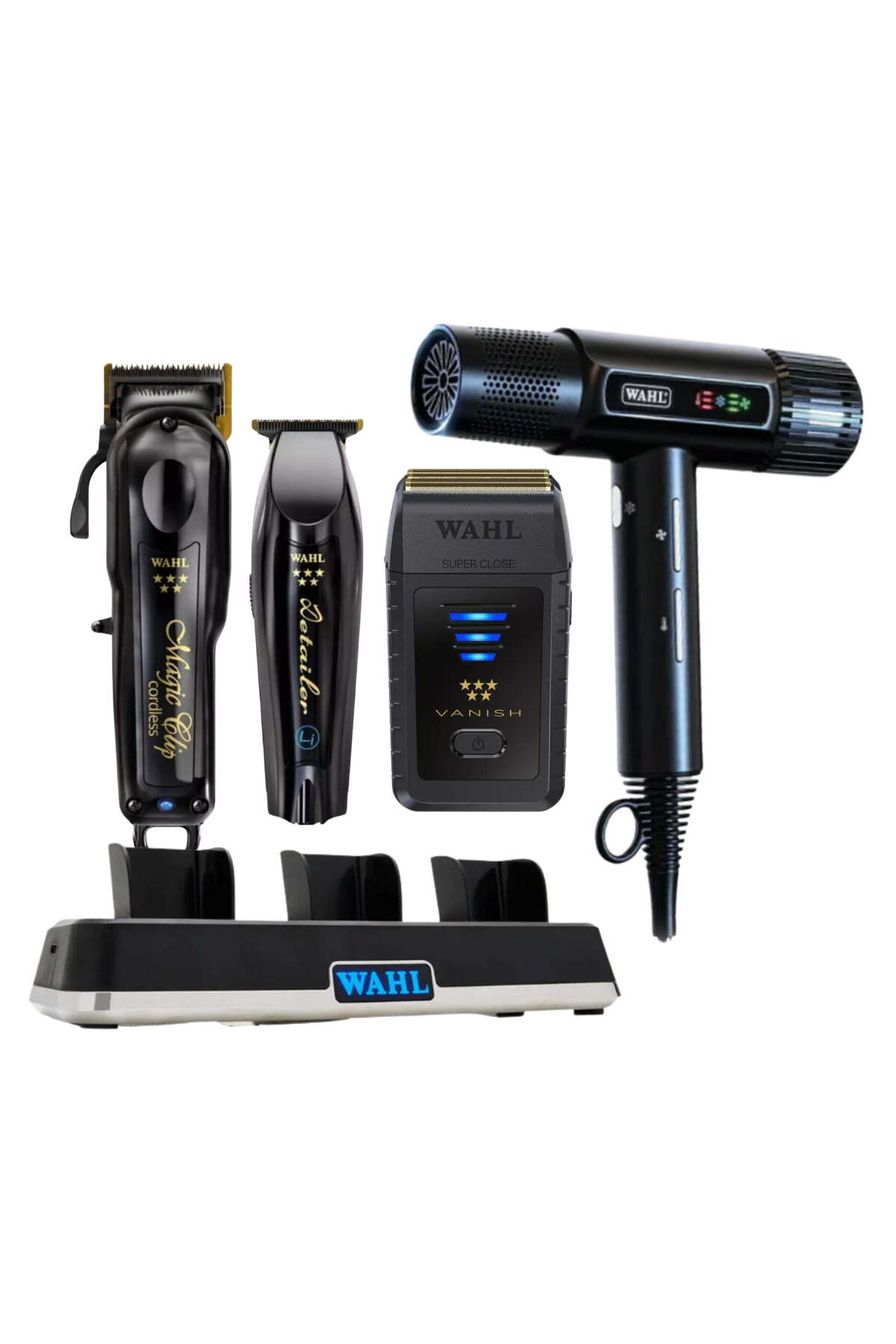 Wahl Cordless Barber Combo Black Magic Clip Clipper & Detailer Trimmer (542-0128); Wahl Vanish Lithium-Ion Foil Shaver (542-0107); Wahl Vanquish T-Shaped Hair Dryer (542-0129); Wahl Professional Power Station - 3 Ports (542-325)