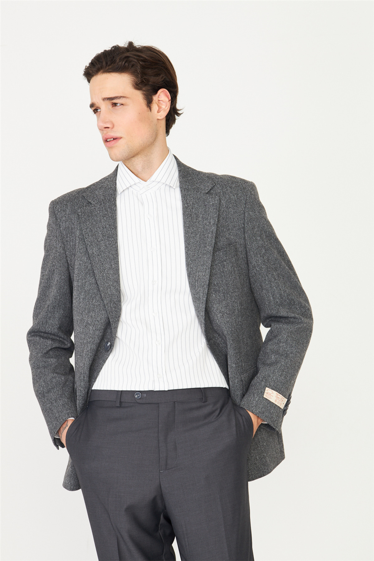 ميزات سترة بليزر منقوشة باللون الرمادي بنمط جلد السمك من White Stone