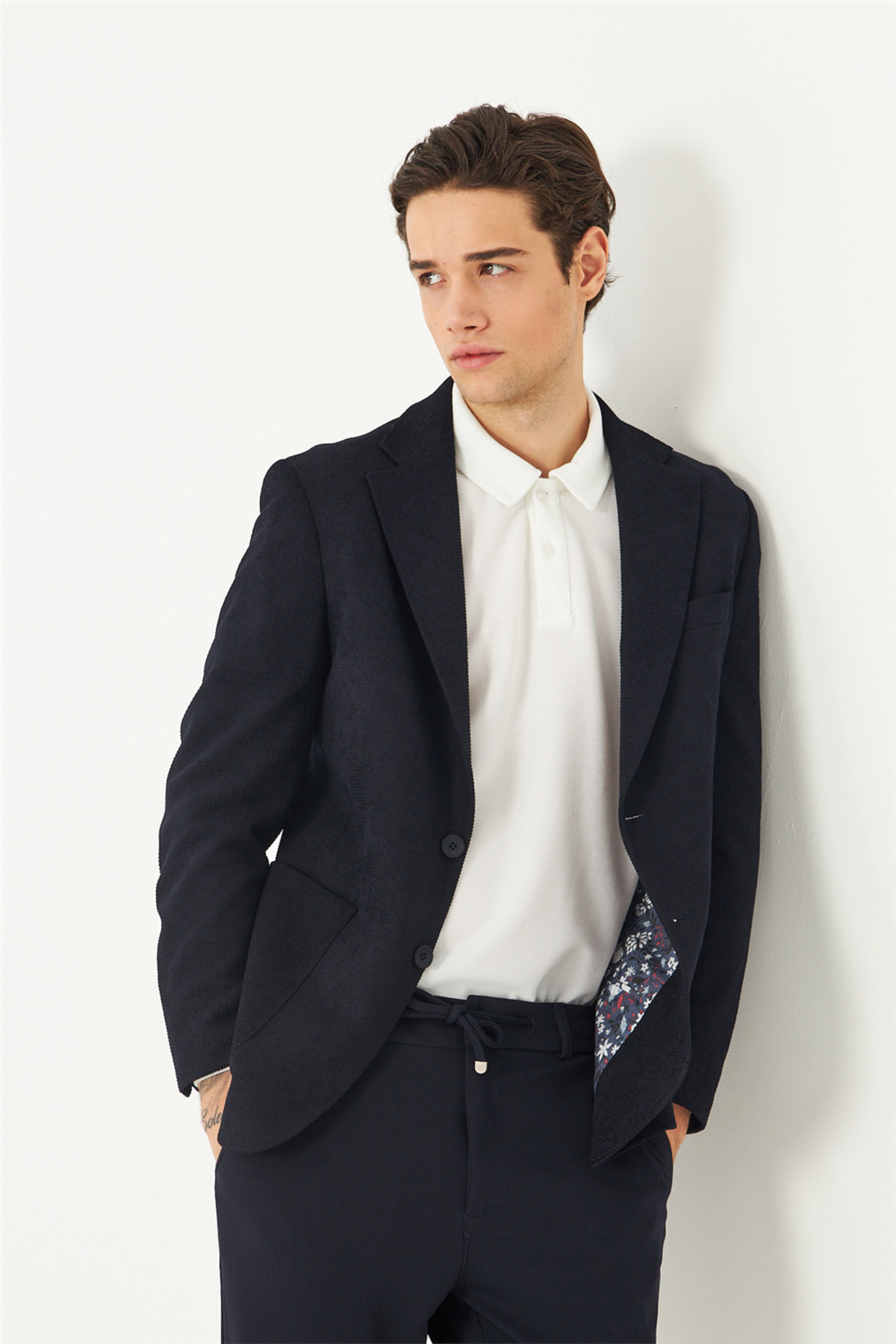 ميزات سترة بليزر منقوشة من الداخل بلون أزرق داكن وملمس خفيف من White Stone