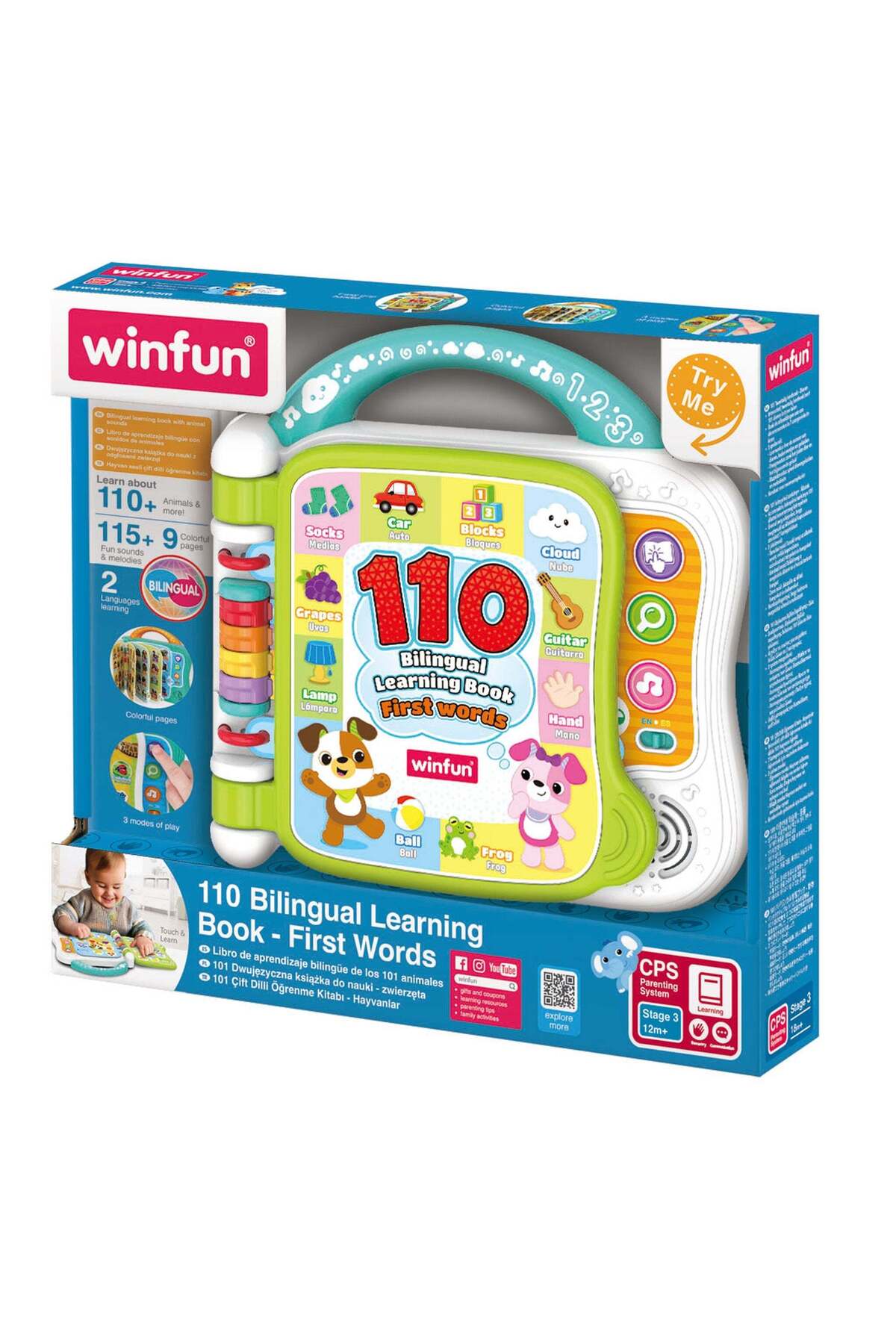 110 first words across various categories in two languages, touch-sensitive pictures to hear words, sounds, and fun facts, carry handle for easy take-along play