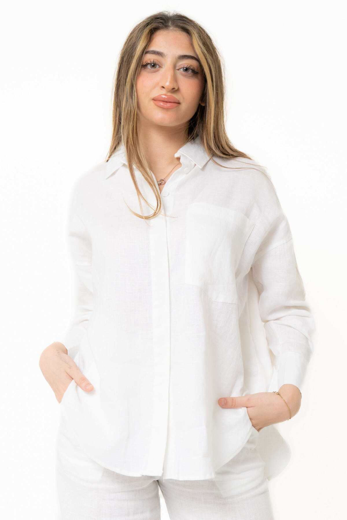 ميزات قميص سادة بأكمام طويلة وجيب من Yola