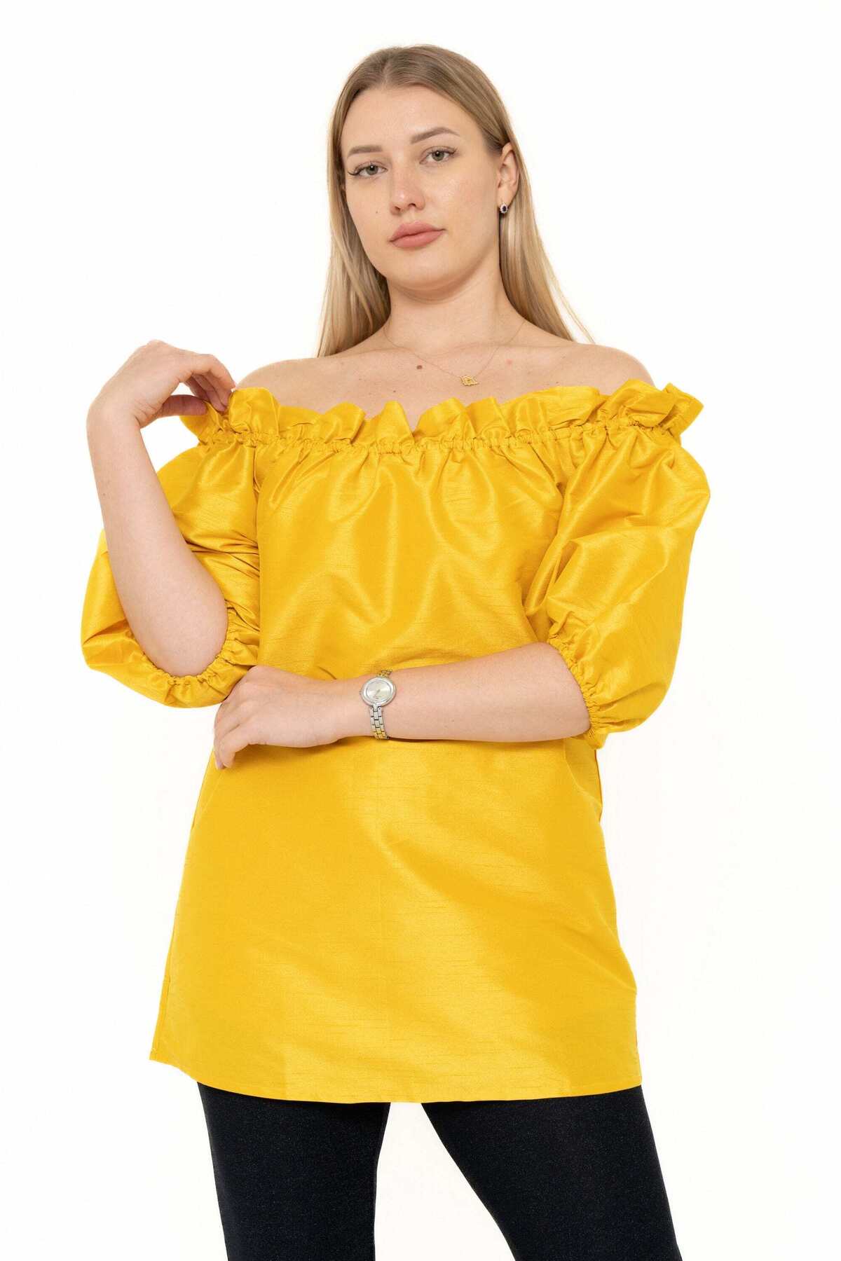 ميزات بلوزة سادة مكشوفة الكتفين مع كشكشة من Yola