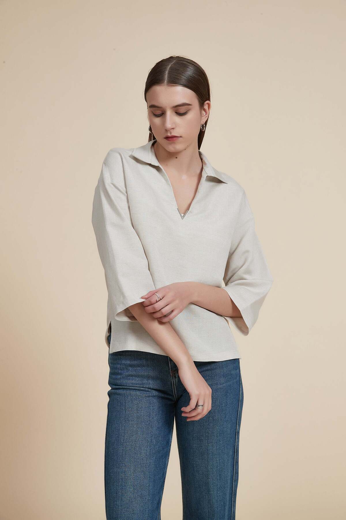 ميزات بلوزة سادة برقبة على شكل حرف V وأكمام ثلاثة أرباع من Yola