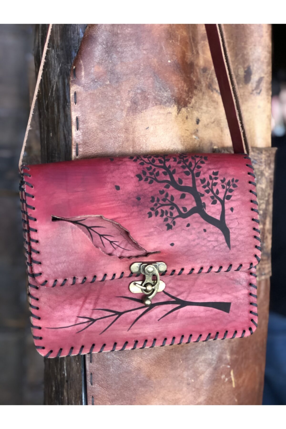 ميزات حقيبة جلدية منقوشة بأوراق الشجر باللون الأحمر من zarif atölye