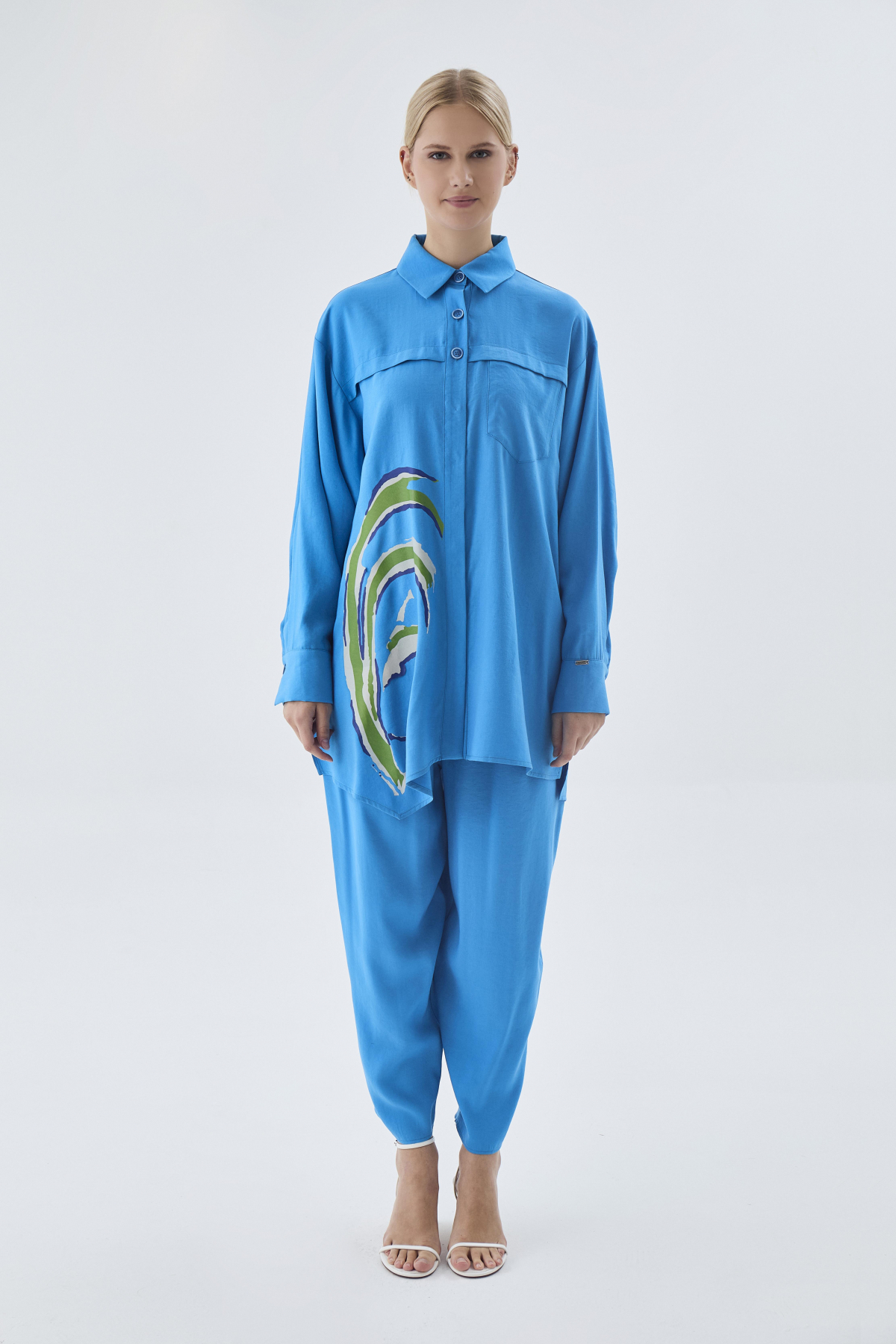ميزات طقم مزدوج منقوش بأزرار باللون الفيروزي 1454 من Zühre