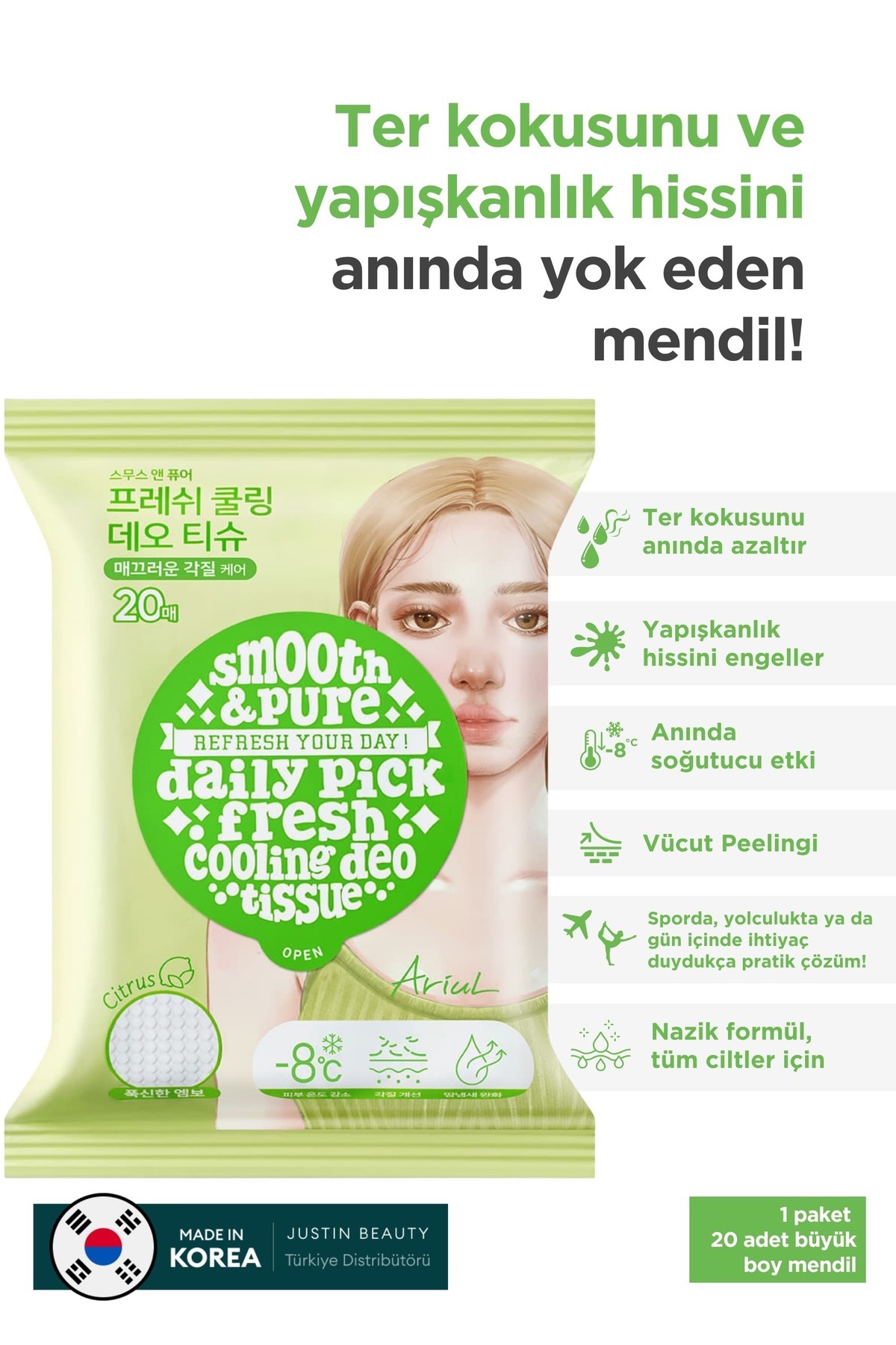 Ariul Smooth & Pure Fresh Cooling Deo Tissue (20 pcs) - Multi Fonksiyonel Vegan Deodorant Mendil Özellikleri