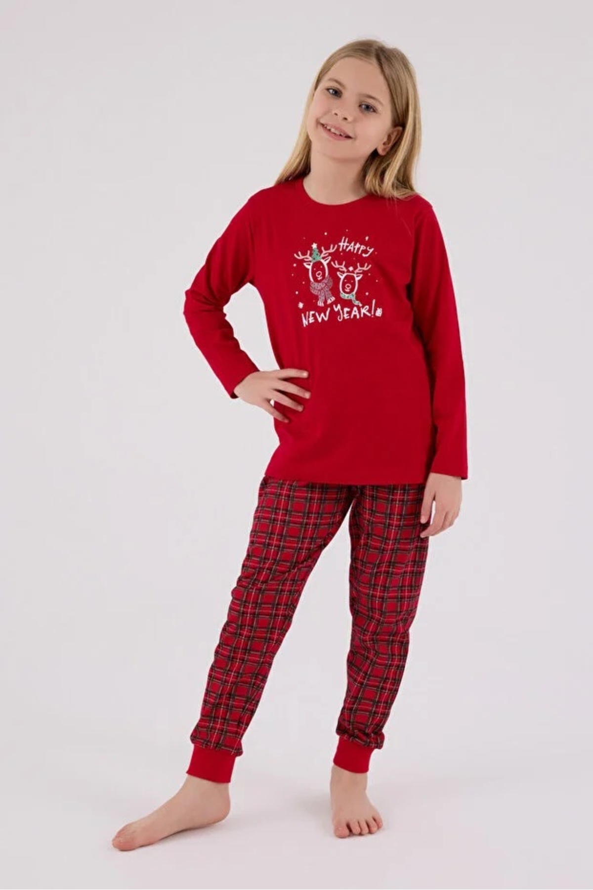 Arnetta %100 PAMUK BİSİKLET YAKA YILBAŞI TEMALI EKOSE DESEN UZUN KOLLU KIZ ÇOCUK PİJAMA TAKIM
