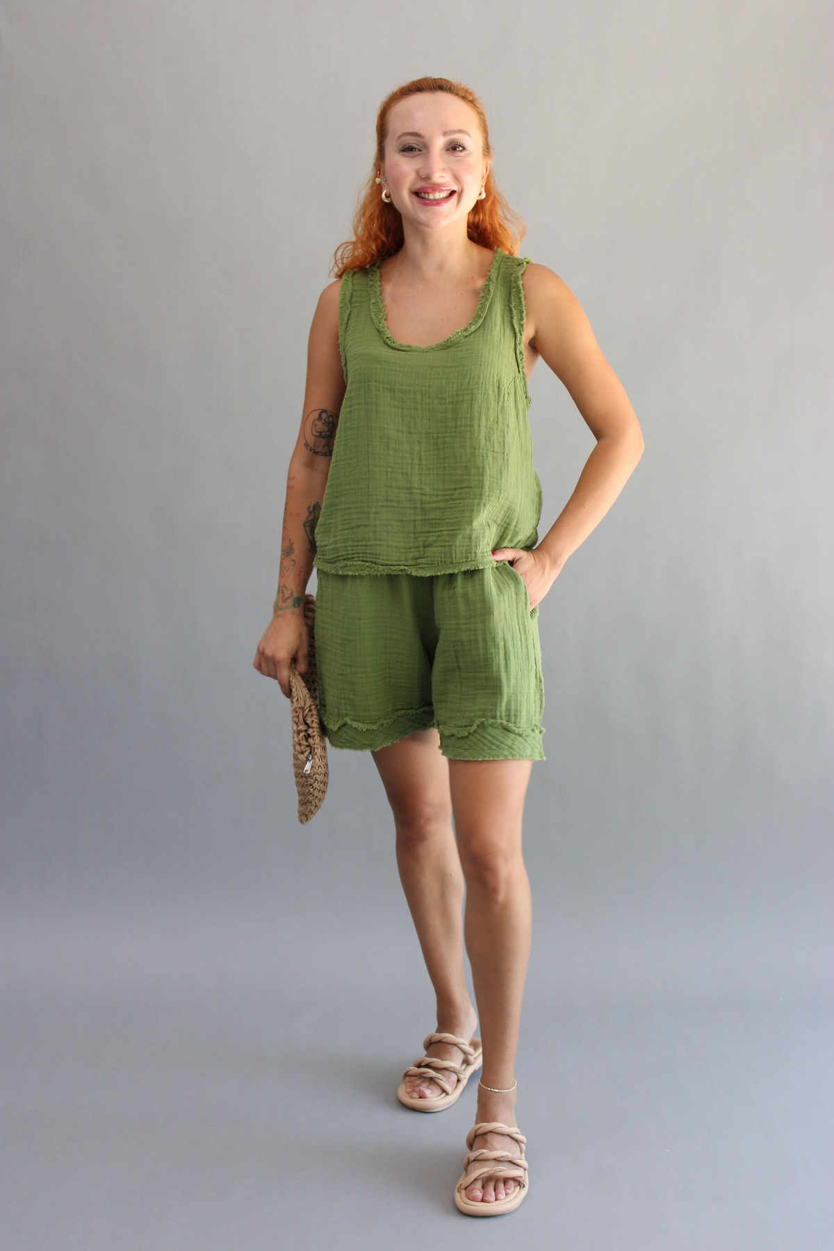 ASC SUN KADIN MÜSLİN SAÇAKLI ŞORT ÇAPRAZ CROP TAKIM Özellikleri
