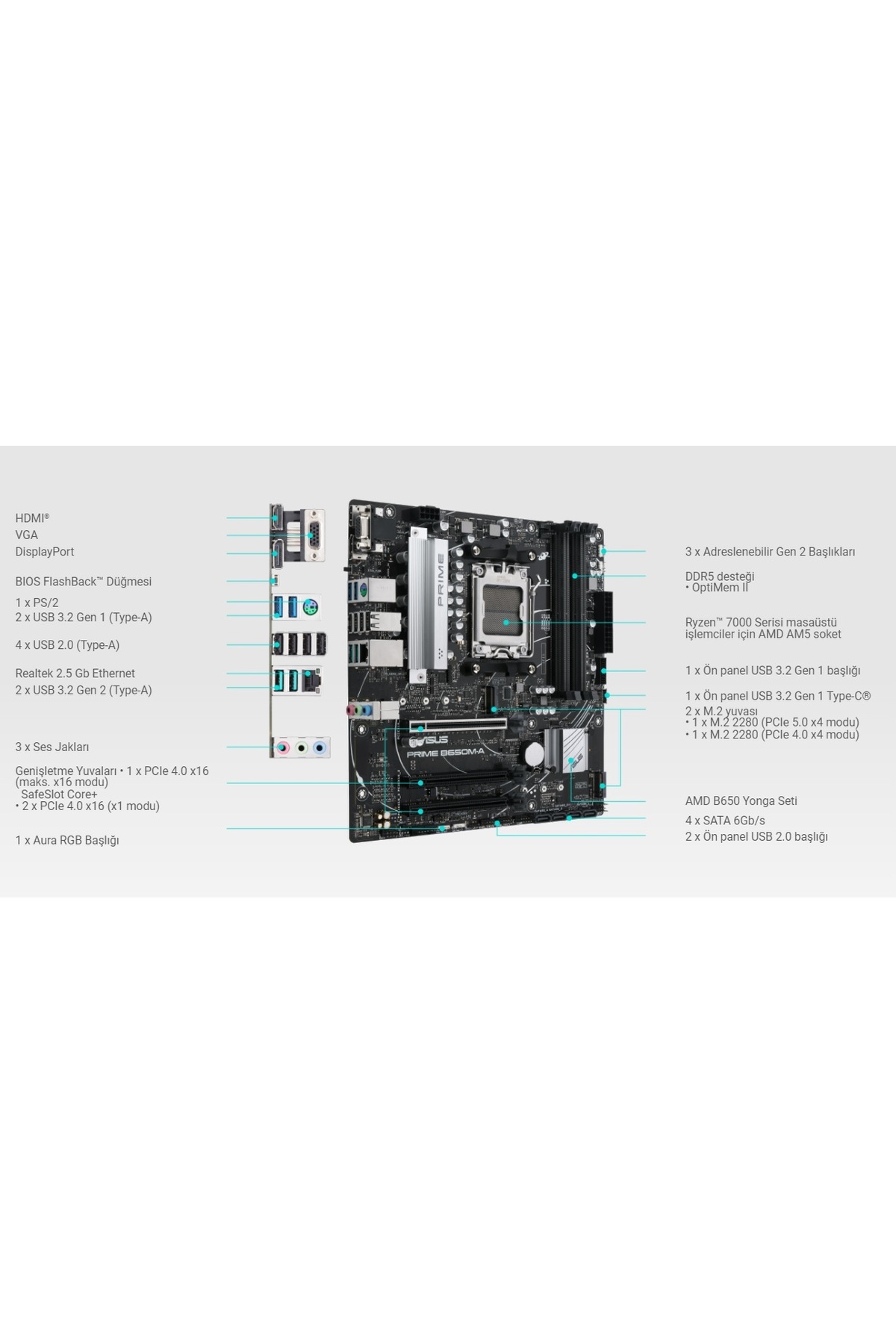 ASUS PRIME B650M-A B650 DDR5 (Vga Yok) GLan 2.5G mATX HD DP 2xM2 USB3 RGB AM5 AMD Anakart