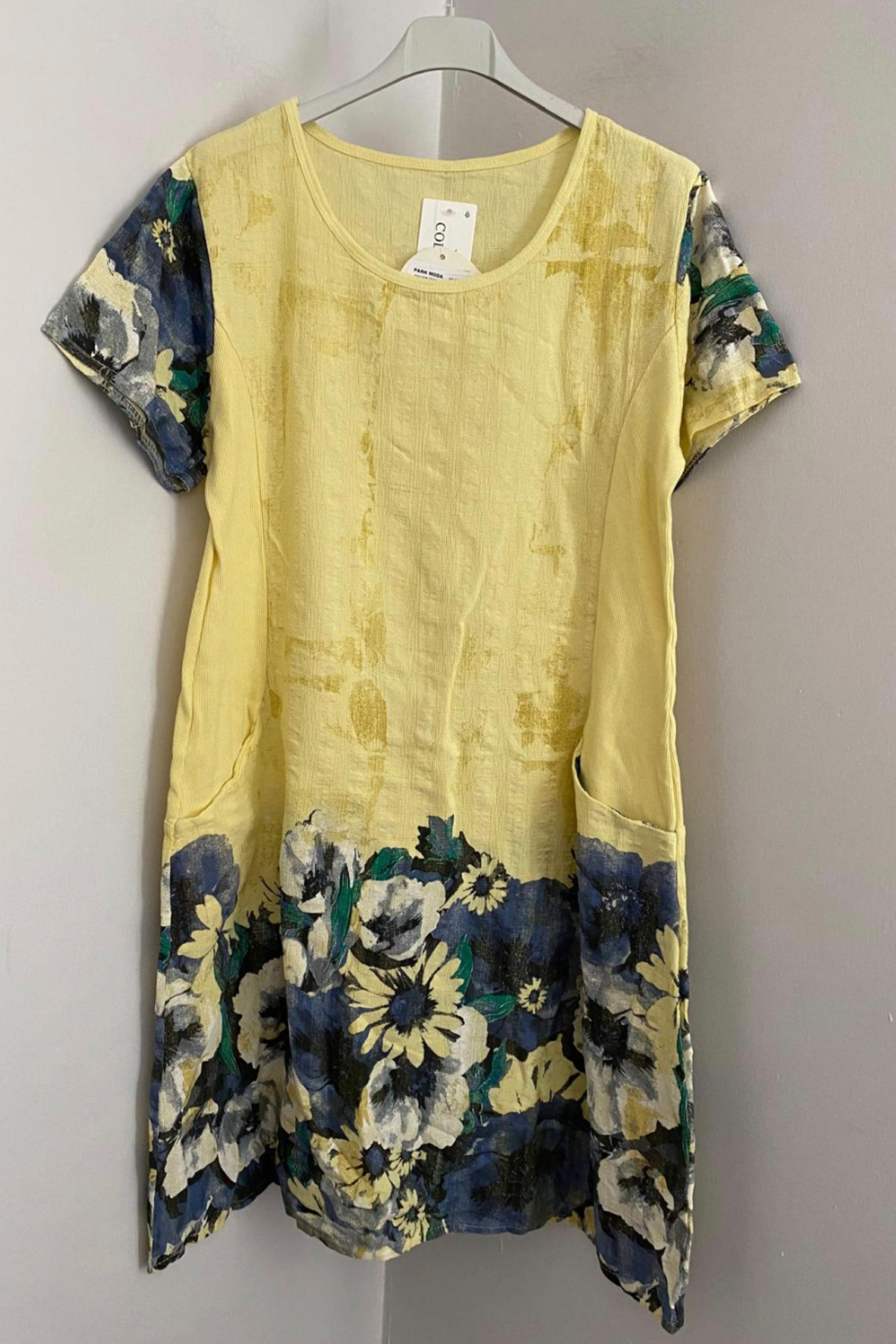 AYASOFYA OTANTIK Kadın İtalyan Sarı Kır Çiçekleri Desen Kısa Kollu Torba Cepli Pamuklu Midi Elbise