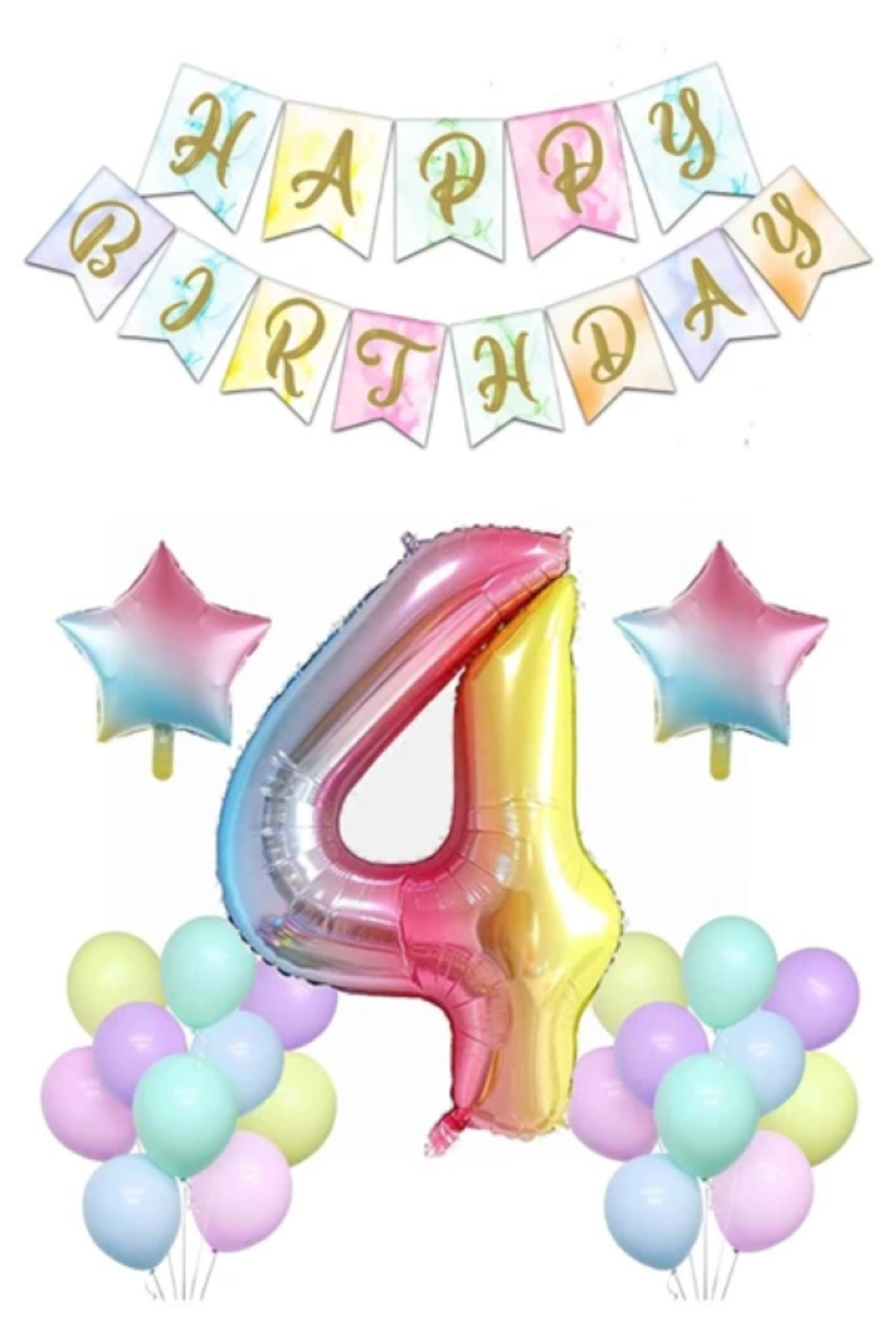 BALON DİYARI Gökkuşağı Konsepti 4 Yaş Doğum Günü Parti Kutlama Seti Rakam Ve Yıldız Folyo Banner Ve Makaron Balon Özellikleri