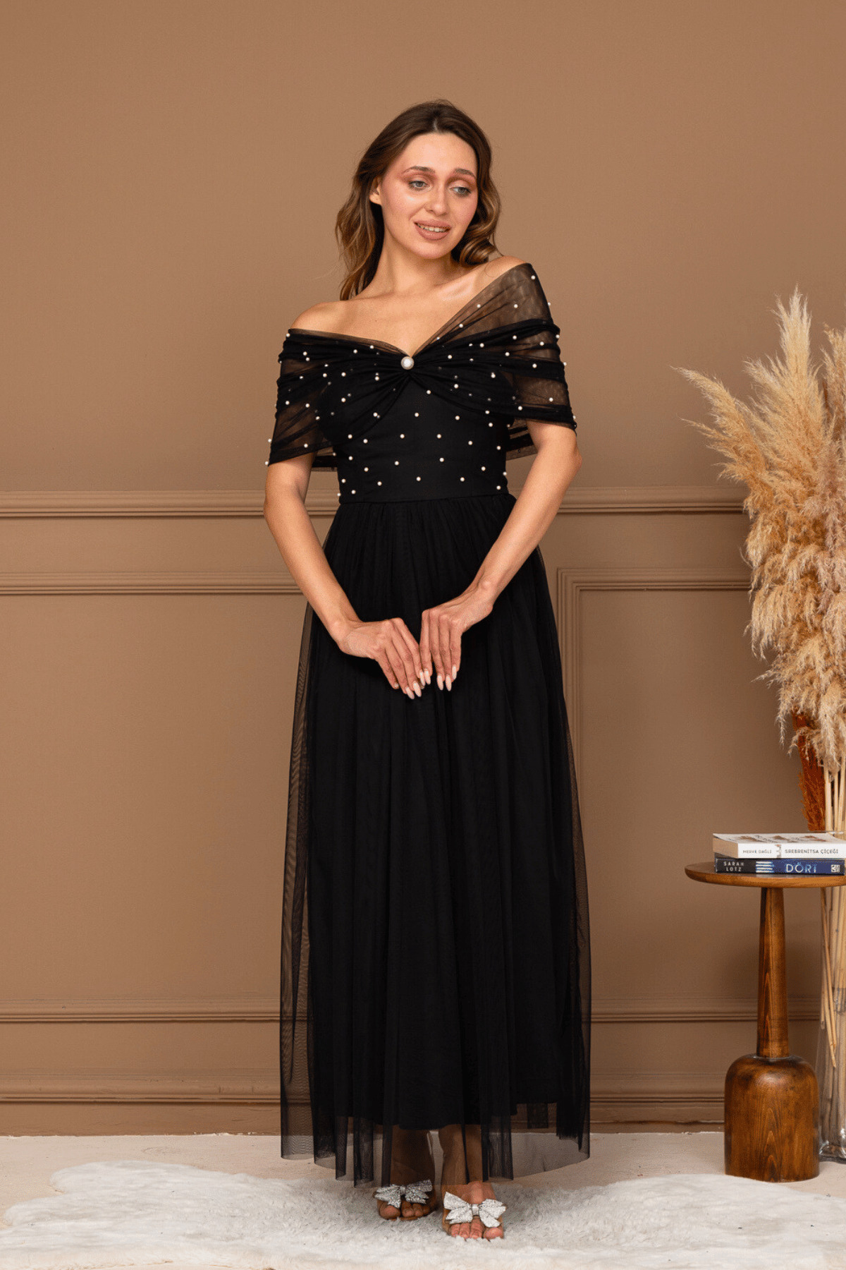 BEYBOS Tül Kumaş İnci Detaylı Midi Boy Elbise - SİYAH