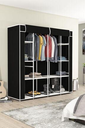 Burak Çelik Borulu Plastik Raflı Siyah Bez Dolap Gardırop