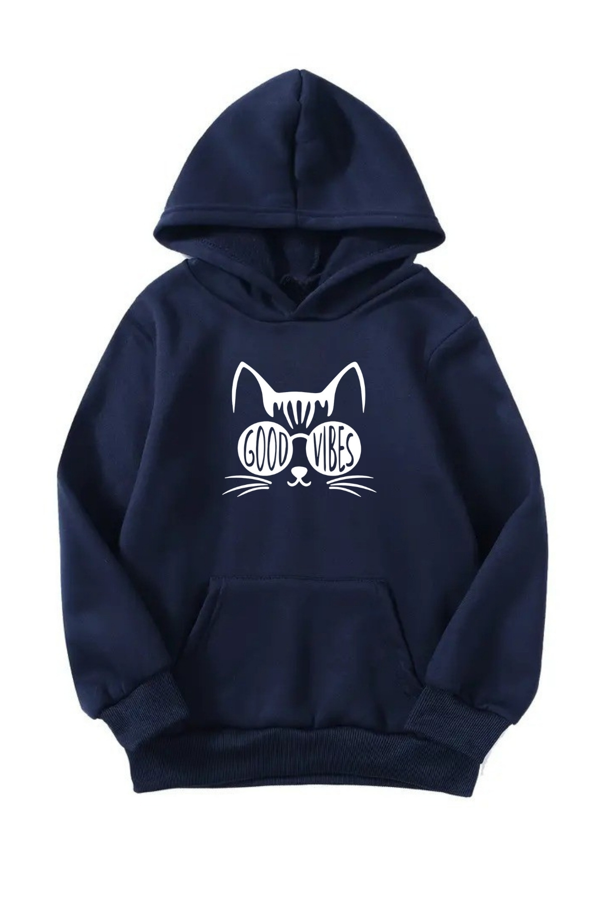 VBSVİBES Унисекс овърсайз зимна блуза с качулка и принт с котешки мотив Good Vibes - тъмно син