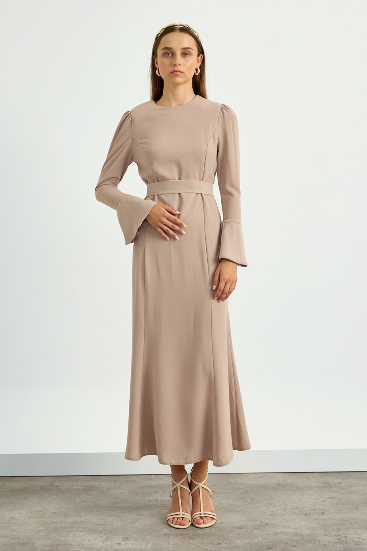 Birgül Bektaş Koyu Vizon Kuşaklı Krep Elbise