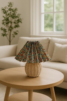 burenze Modern Abajur Pileli Çiçek Desenli Abajur Hasır Gövde Masa Lambası