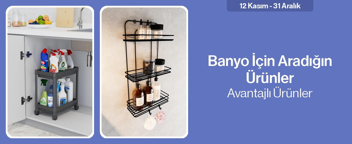 Banyo düzenini ve kullanım ihtiyaçlarını karşılamak için tasarlanan birçok ürün bulunur. Havlu & havlu seti bu ihtiyaçların başında gelir. Pamuksu ve yumuşak dokuları ile ön plana çıkan birçok ürün mevcuttur. Bornoz modelleri de çizgili, düz, renkli tasarımlarıyla kadınların ve erkeklerin zevkine hitap eder. Banyo seti içerisinde diş fırçalık, çöp kovası, tuvalet fırçası, sıvı ve katı sabunluk vardır. Çamaşırlık çeşitleri de alanın derli toplu görünmesi için tercih edilir. Banyo dolabı mekanın düzeni için satın alınan bir diğer üründür. Farklı tasarım özelliklerine sahip çeşitleri ile kullanım kolaylığı sağlar. Banyo paspası modelleri dekorasyonun tamamlanması için üretilir. Ev gereçleri kategorisinde yer alan parçaların büyük çoğunluğu mevcut alanların kullanışlı hale getirilmesi amacına hizmet eder. Özellikle düzenleyici kullanımı bu noktada önemlidir. Dolap ve çekmece içlerinde düzen oluşmak için sıkça tercih edilir. Sepet & saklama kutusu çeşitleri ile birçok malzeme kolay bir şekilde muhafaza edilir. Yapı market kategorisinde bulunan pek çok ürüne evde sıklıkla ihtiyaç duyulur. Özellikli elektrikli el aleti işleri kolaylaştırır. Eşyaları monte ederken matkap çeşitlerini kullanabilirsiniz. Banyo yapı malzemeleri oluşturulurken bu aletleri tercih edebilirsiniz. Hırdavat ürünleri arasında bulunan kulp, yapıştırıcı, merdiven, su pompası, sineklik gibi parçalar yaşam alanlarında ihtiyacınız olabilecek seçenekleri içerir. Boya yapmak için gerekli olan merdiven çeşitlerini de ürünler arasında bulmak mümkündür. Ampul takarken de merdivenin sağladığı avantajdan yararlanabilirsiniz.