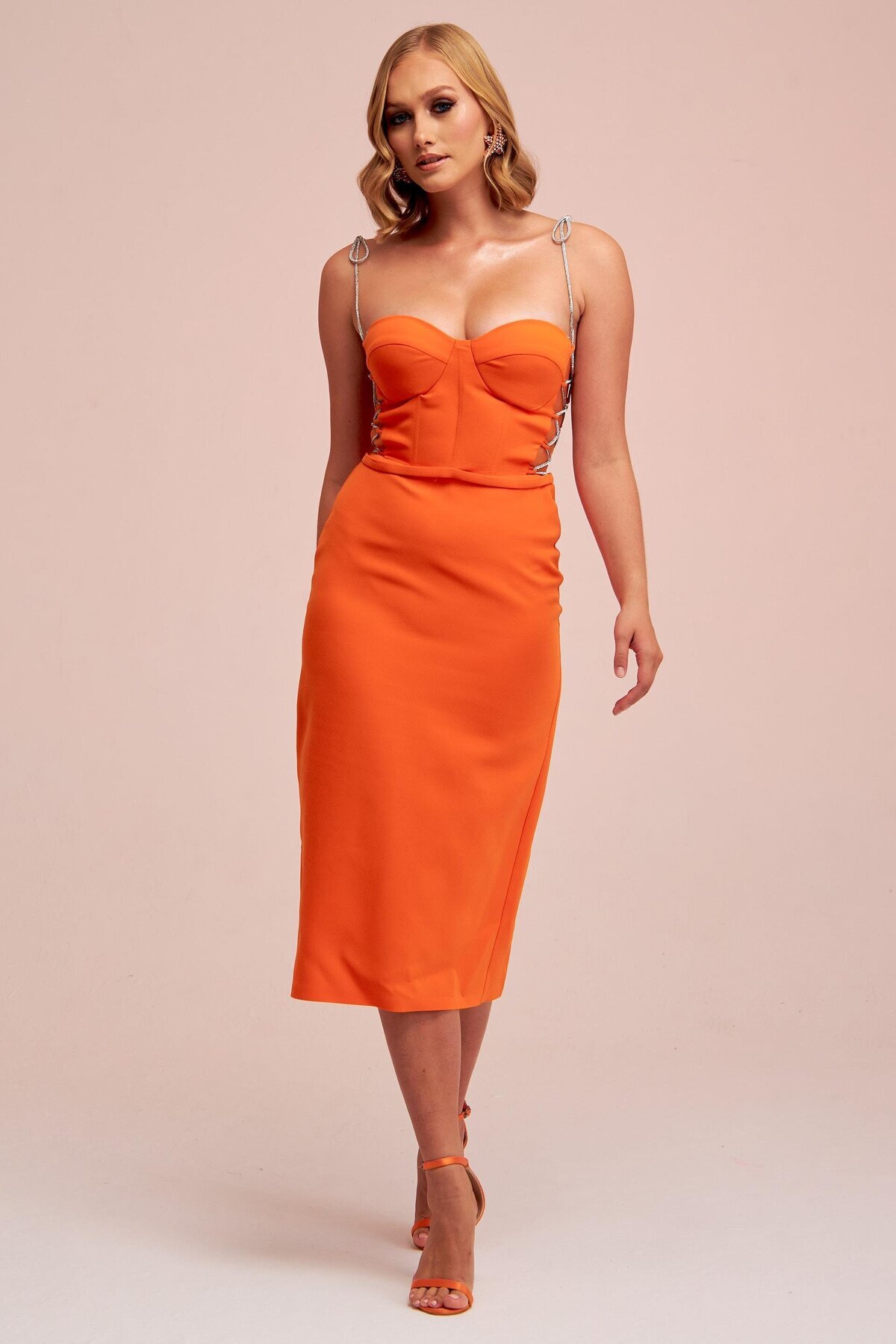 Carmen Orange Taş Bağcıklı Midi Krep Abiye Elbise Özellikleri