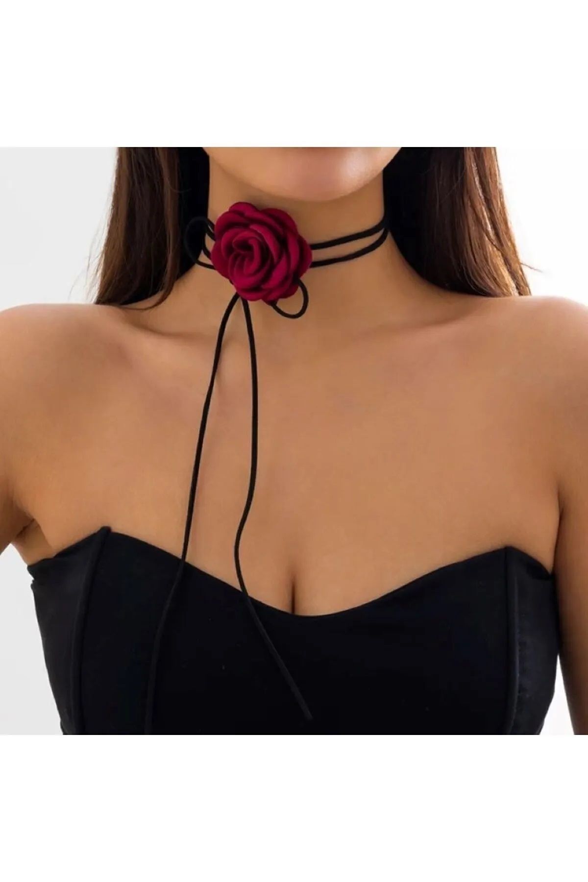 CAXBERN Bordo Gül Saten Kolye Bağcıklı Choker Kolye