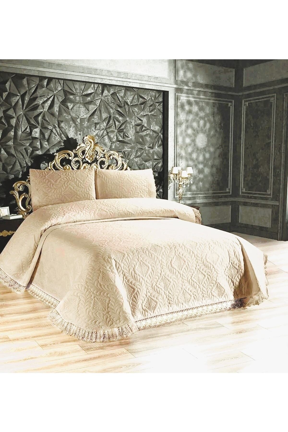 çeyizden Çift Kişilik Ultrasonik Kapitoneli Fransız Dantelli Güpürlü Yatak Örtüsü Takımı Kapiçino Özellikleri