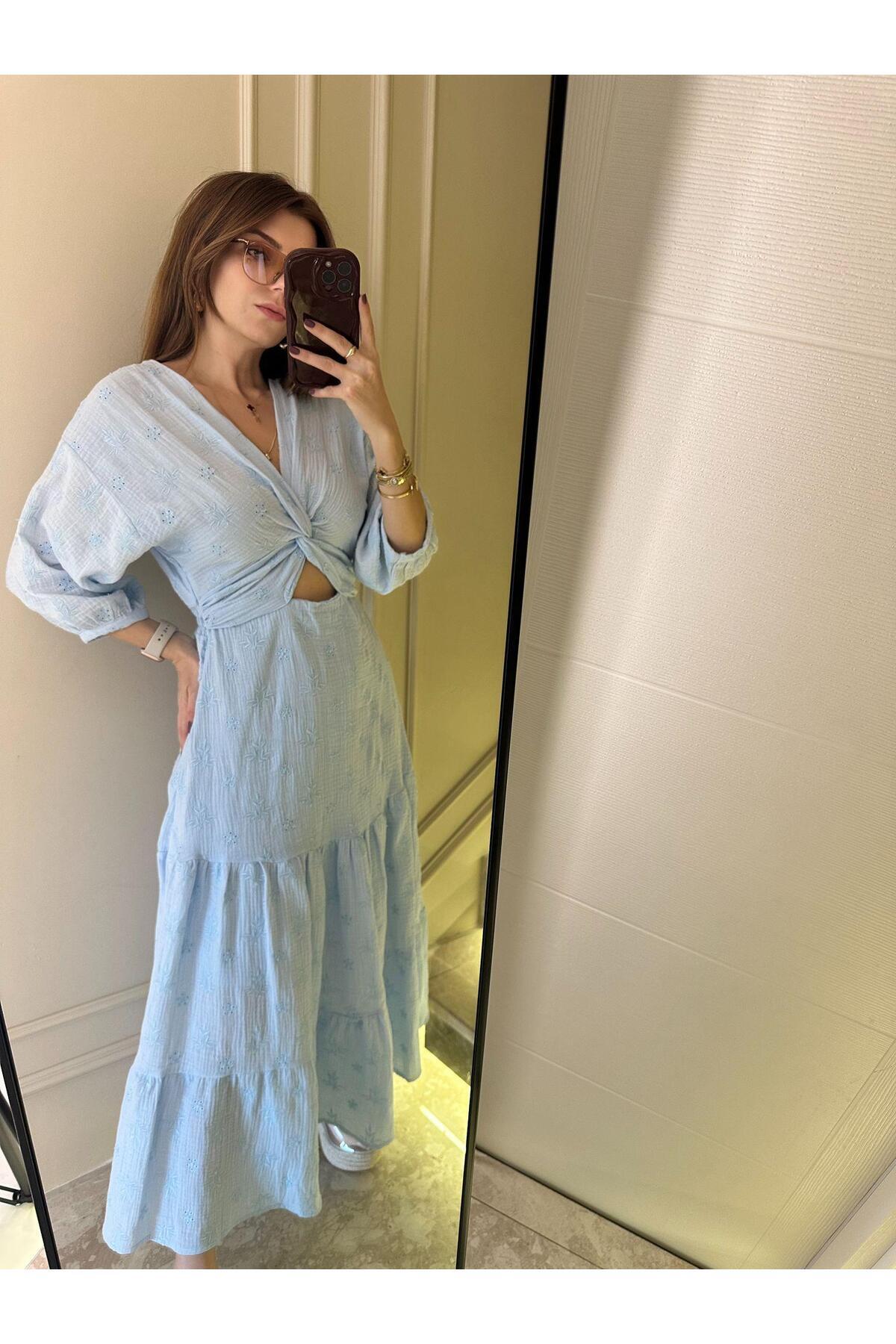Chamakh Mavi Nakışlı Müslin Kumaş Elbise