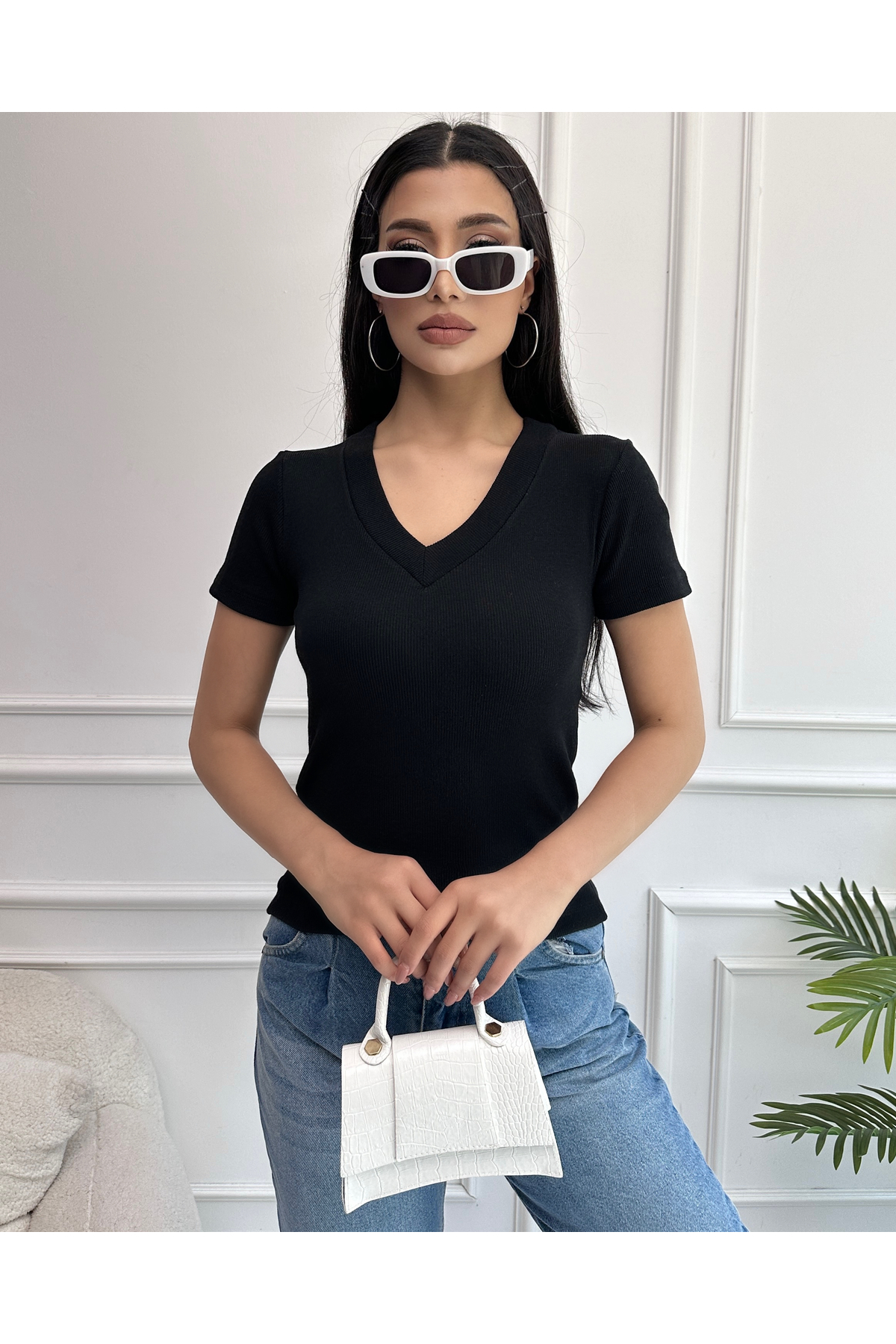 Chicup Kadın Siyah V Yaka Fitilli Örme Bluz
