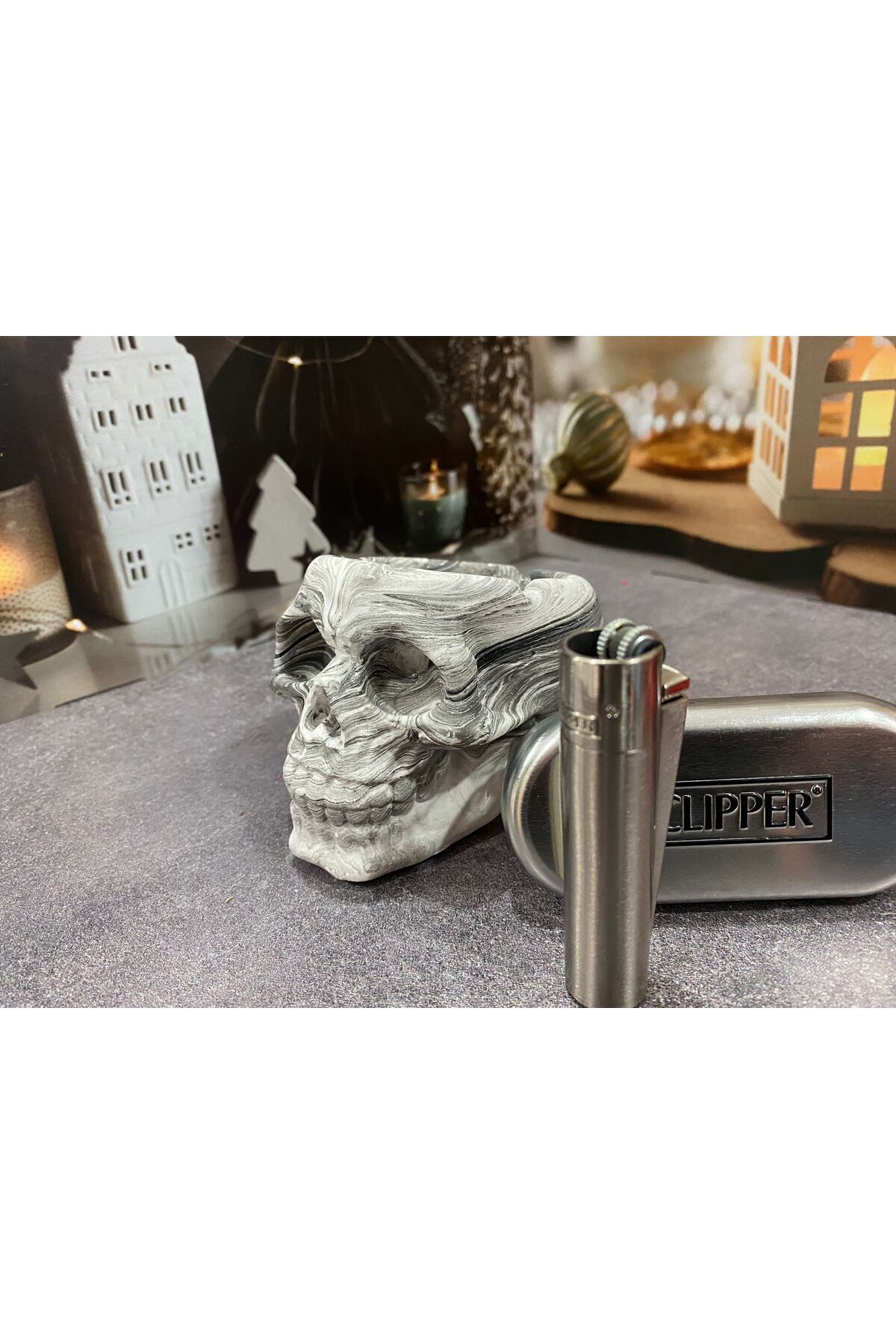 Clipper Metal Gri Çakmak ve Kuru Kafa Küllük Set