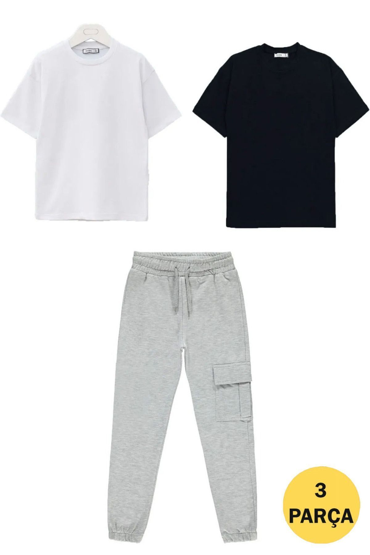 cm buseyiz Buseyiz 3 parça kız erkek set 1 adet kargo cep eşofman altı 2 adet basic t-shirt 7-14 yaş Özellikleri
