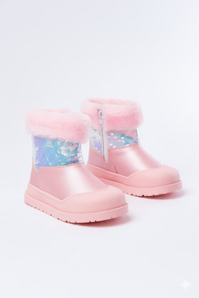 Tonny Black Çocuk Unisex Pudra Faylon Taban İçi Kürklü Lastik Bağcıklı Bot
