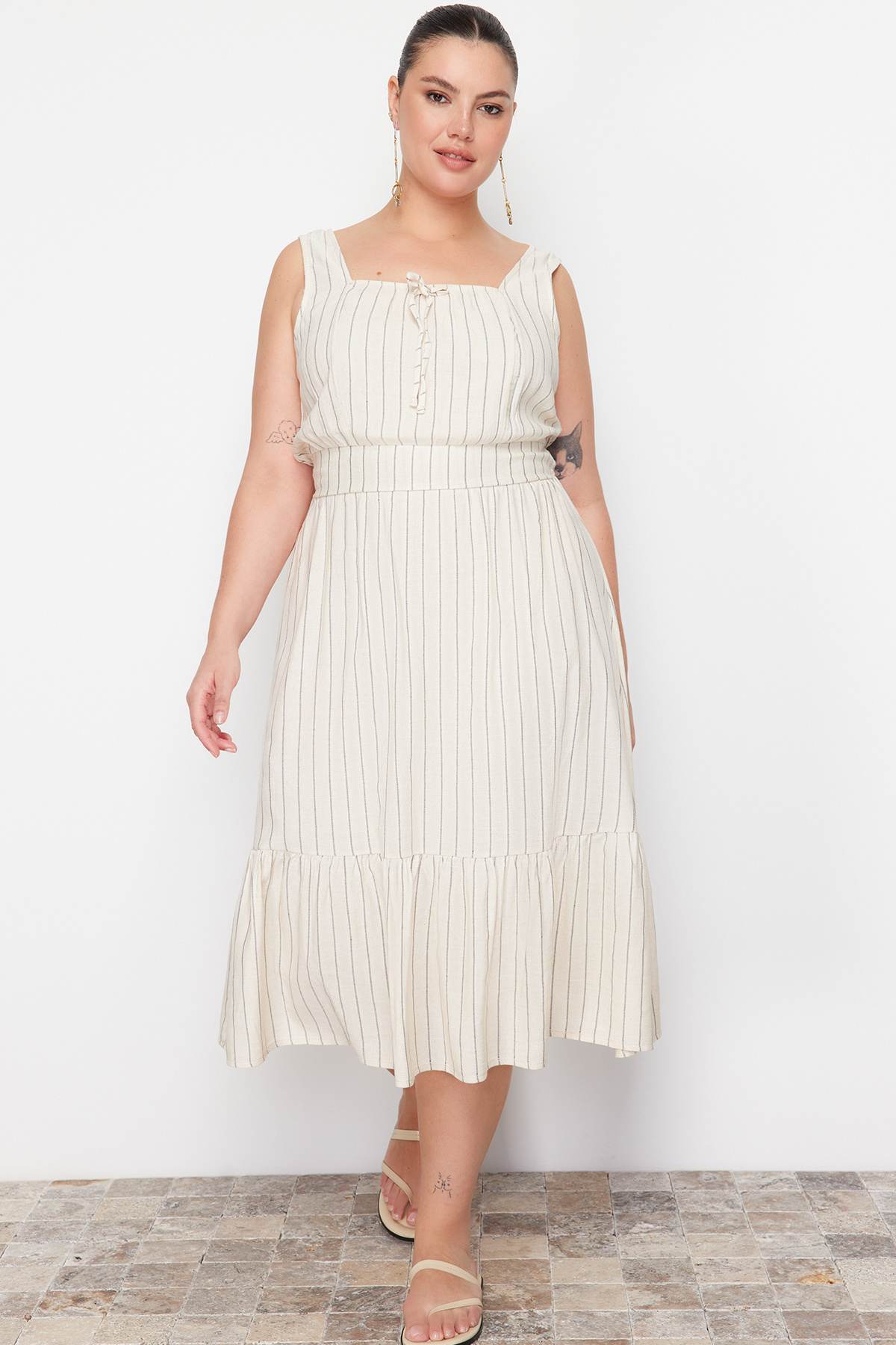 Vlastnosti Trendyol Curve Béžové tkané šaty s čtvercovým límcem A-Line TBBSS24AH00075