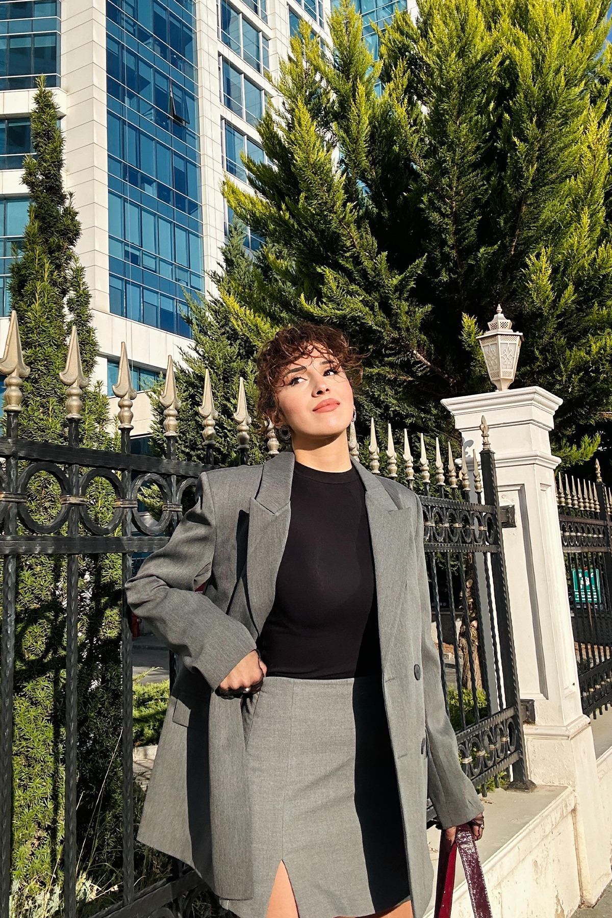 Damla Demli Yırtmaçlı Gri Şort Etek