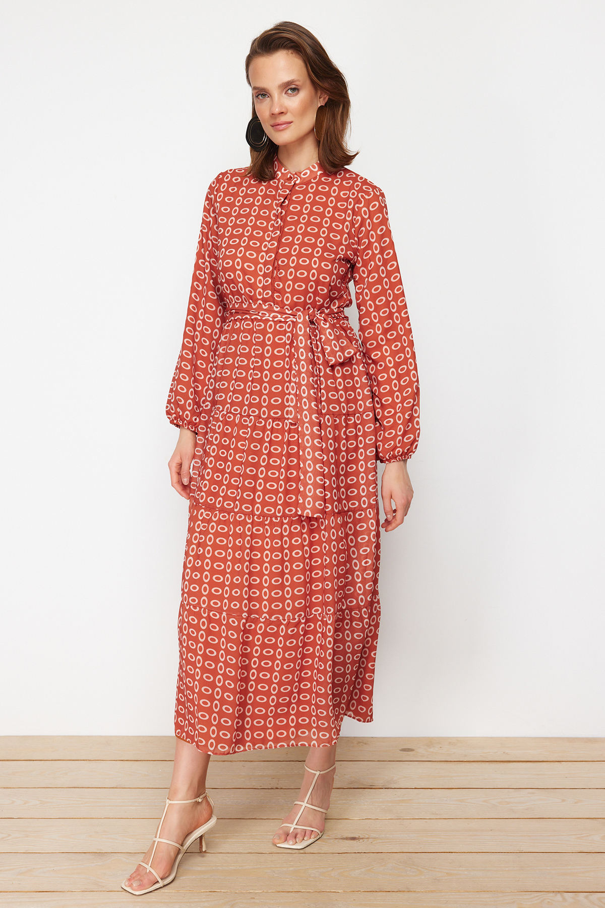 Trendyol Modest Kleid aus gewebtem Chiffon mit geometrischem Muster und Gürtel, Stehkragen und Futter TCTSS21EL3346 Merkmale