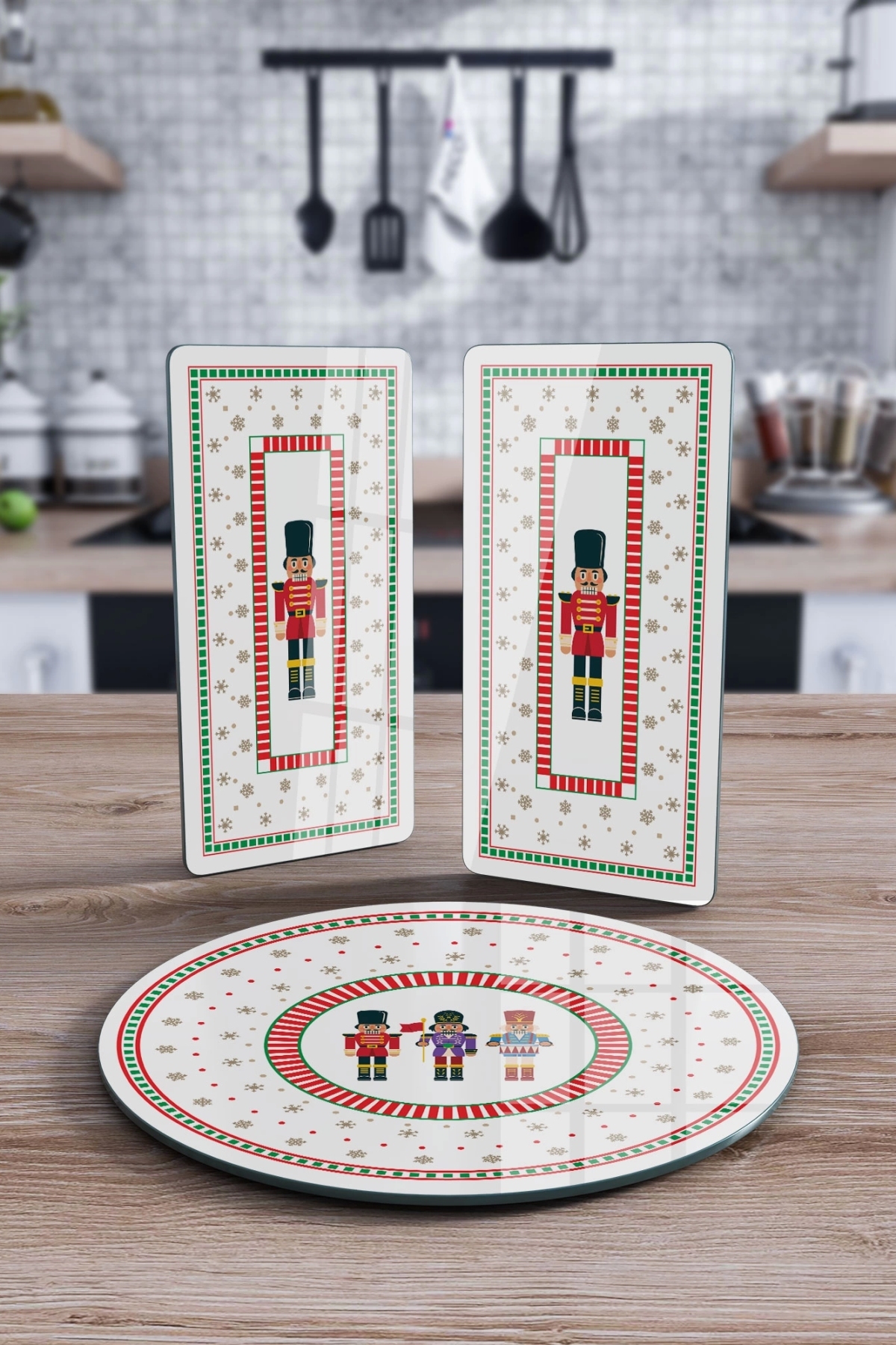 Decovetro Cam Sunum Servis Tabağı 3'lü Yuvarlak Set Yılbaşı Fındıkkıran Desenli Özellikleri