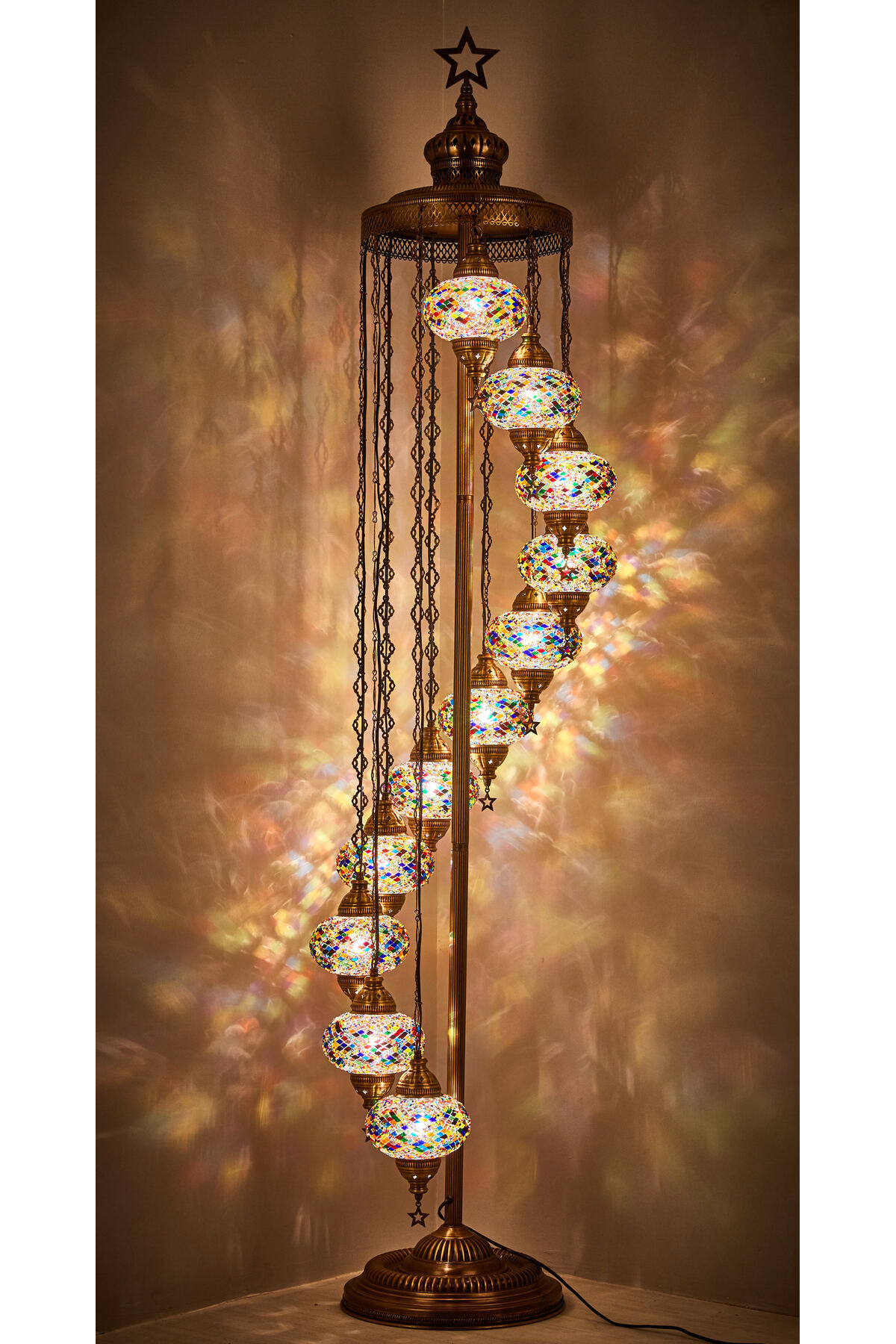Demmex El Yapımı Otantik Mozaik Renkli Cam Lambader Taban Lambası Ayaklı Lambader 11 Camlı 2.1 Metre