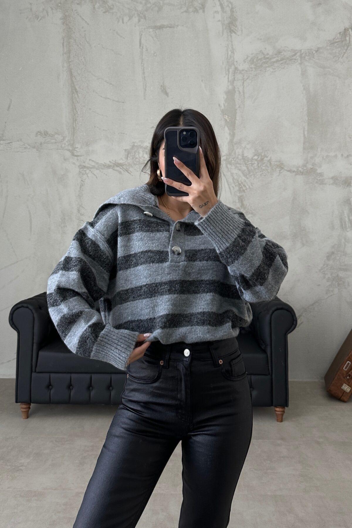 DENİZ BASIC Antrasit - Çizgili Düğmeli Kazak