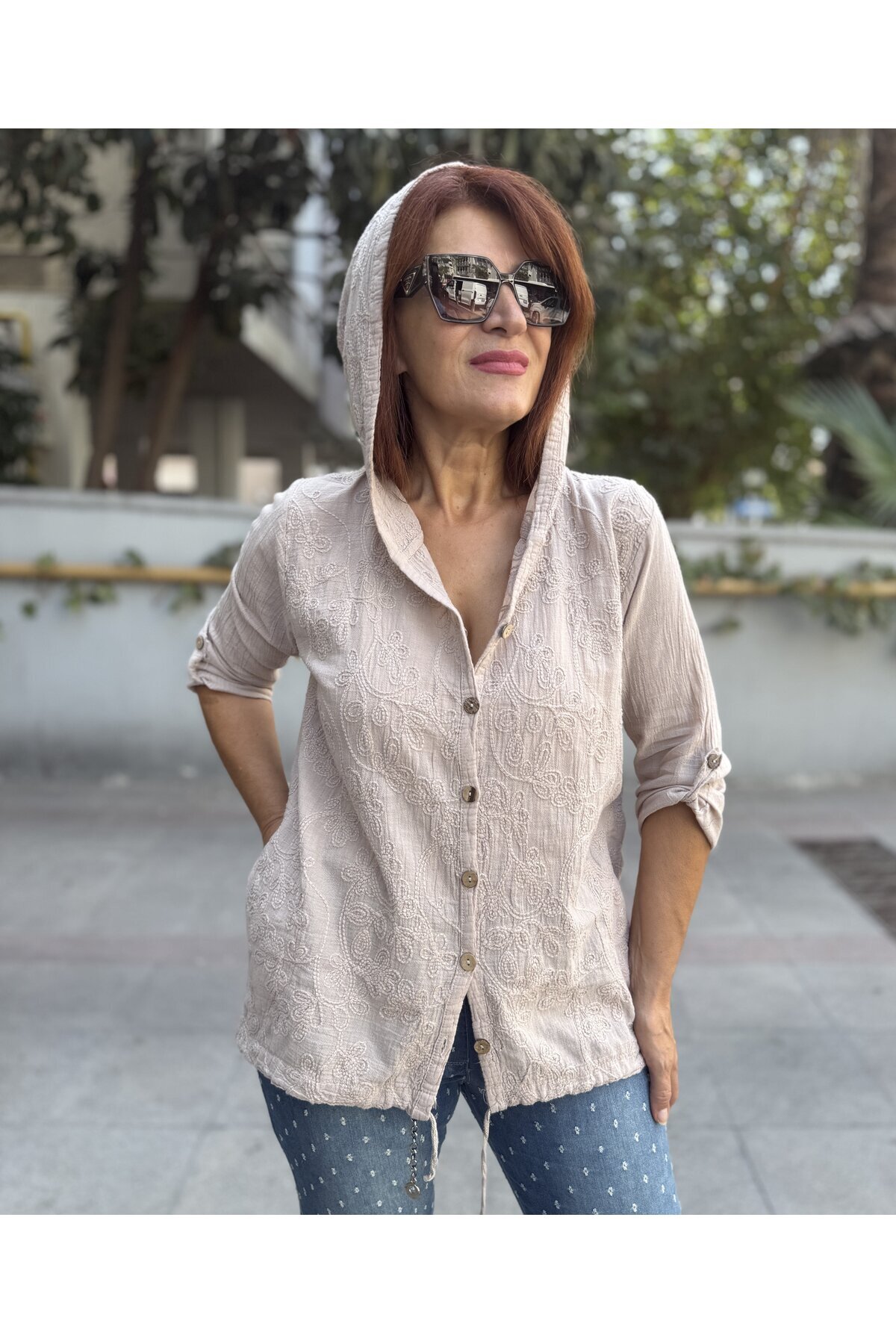 DenizEge Brode Desen Gömlek Kapüşonlu Bej