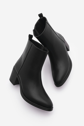 CİMİLİ SHOES Kadın Siyah Cilt Topuklu Bot Sivri Burun Yandan Fermuarlı Kalın Ökçe