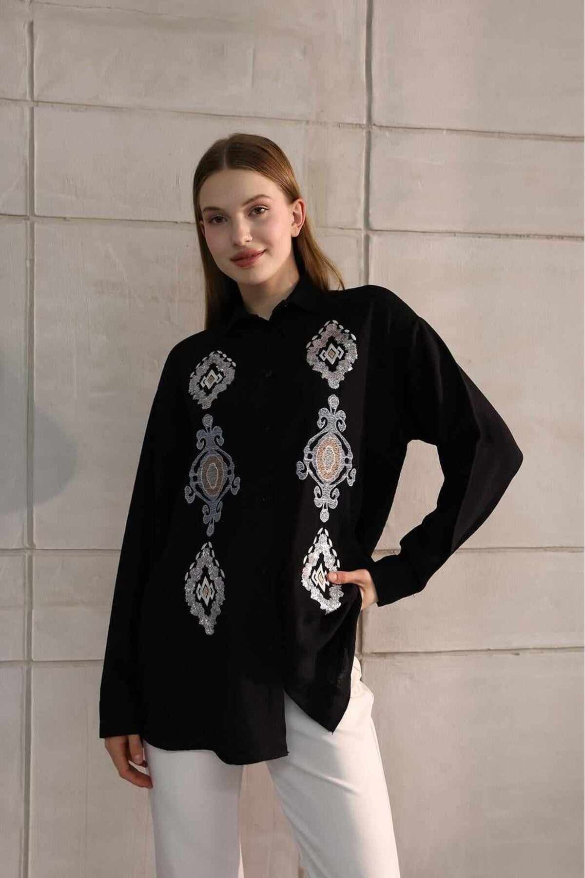 DHDmoda Keten Nakışlı Pullu Gömlek