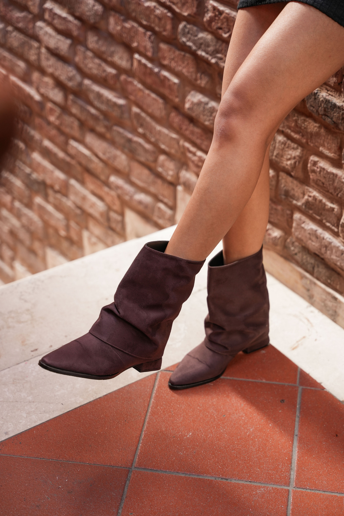 diclepolat Kadın Kahve Süet Alçak Topuklu Sivri Burun Dökümlü Bot Alora
