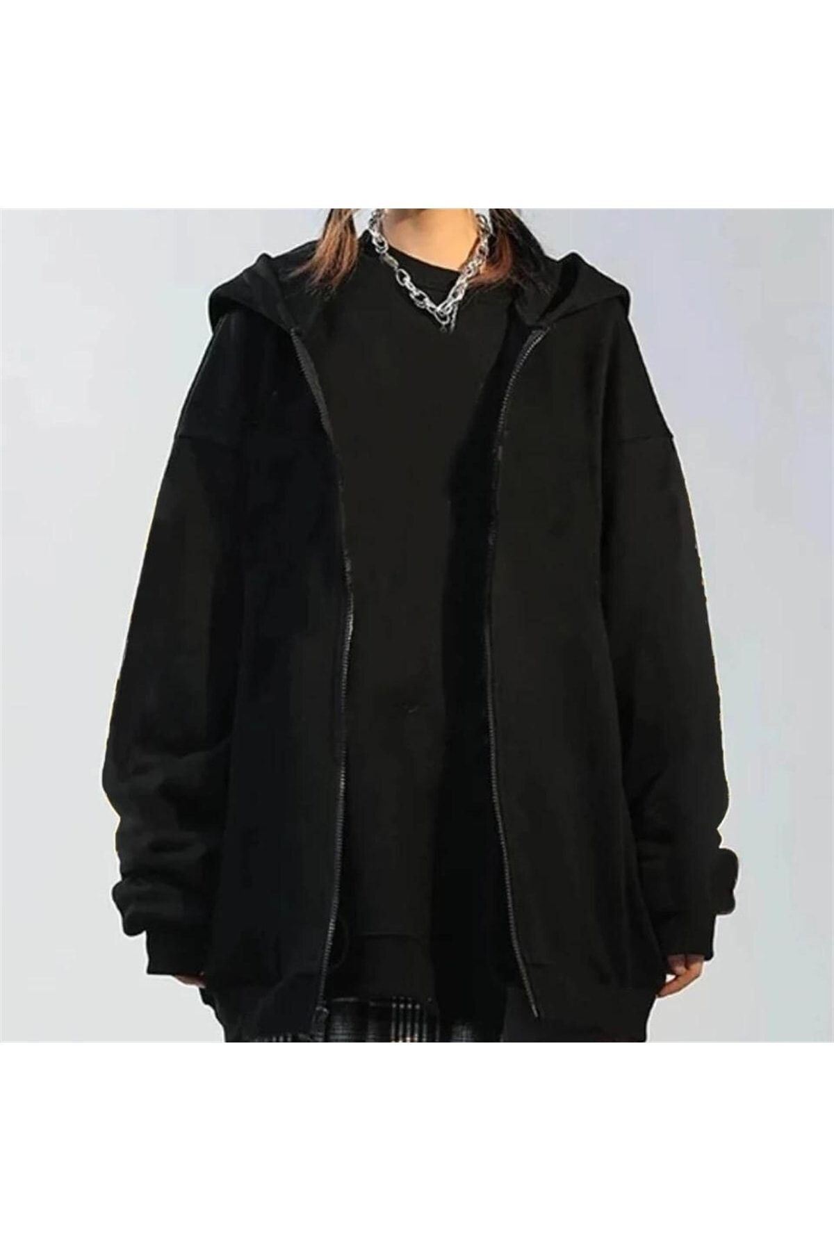 DUBU BUTİK Basic Düz Hırka - Siyah Oversize Kapüşonlu
