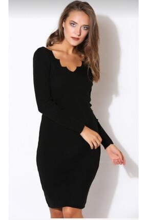MEGOMEL Siyah Kare Yaka Uzun Kollu Likralı Mini Elbise ( Mevsimlik ve Kışlık )