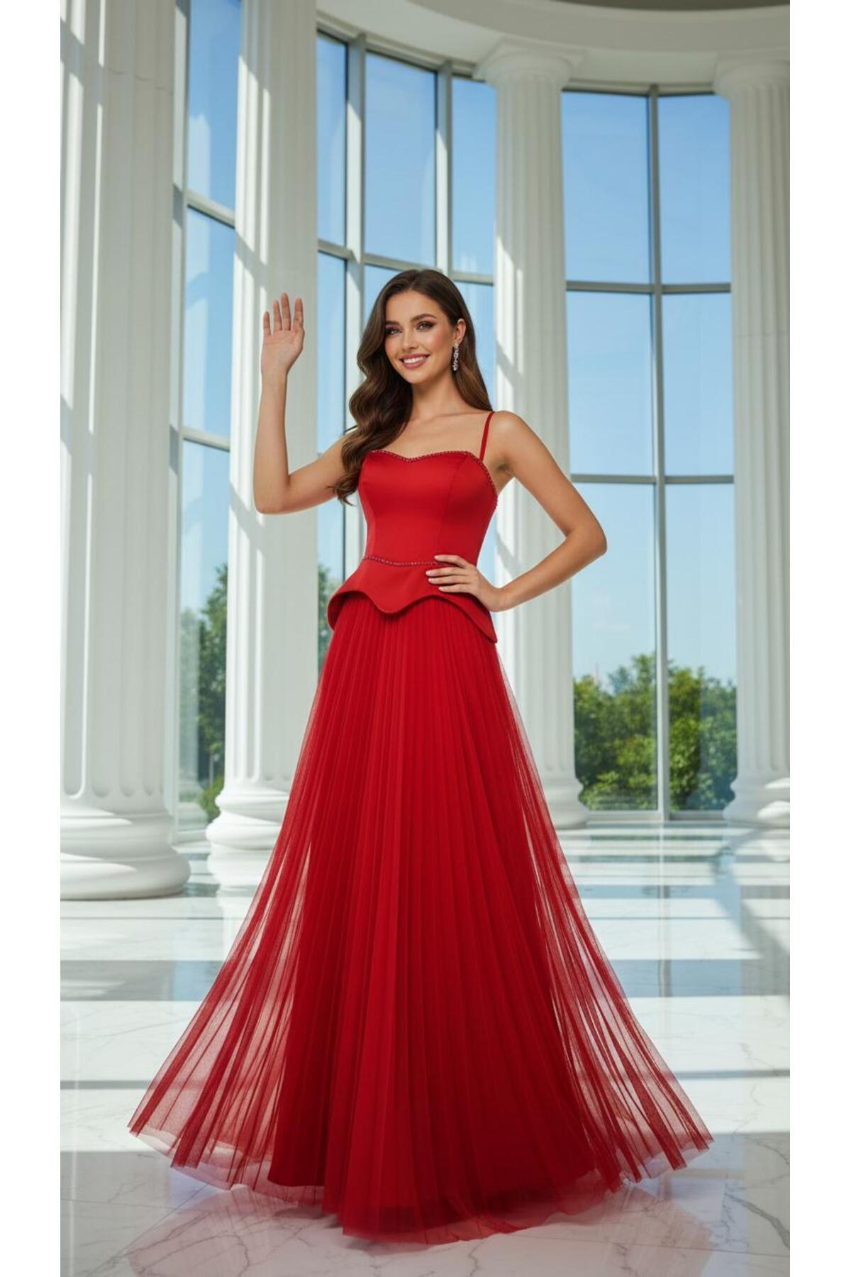 DWT İnce Askılı Pliseli Krep Abiye Elbise